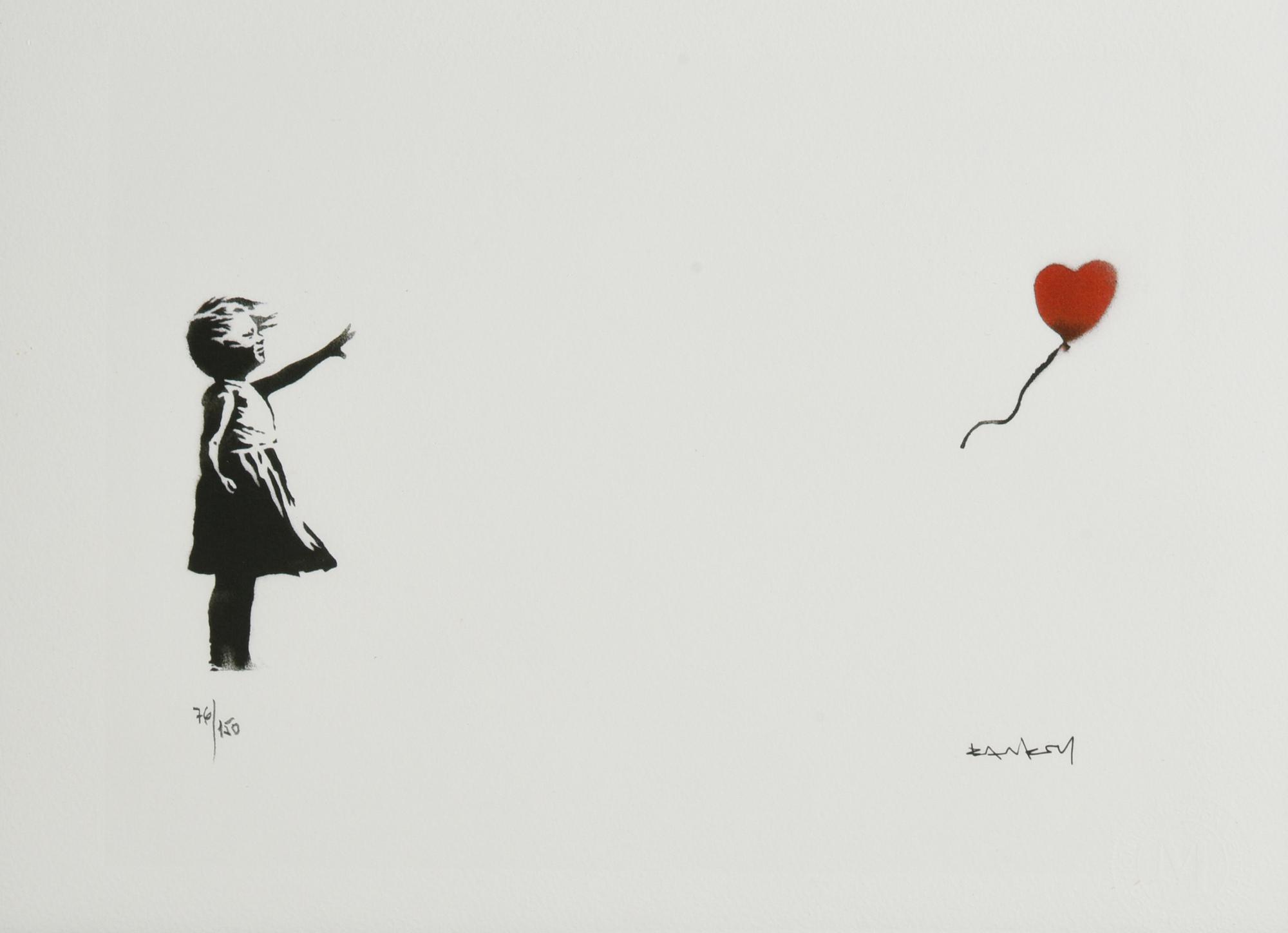 Da Banksy GIRL WITH BALLOON eliografia su carta, cm 28,5x38; es. 76/150 firma...