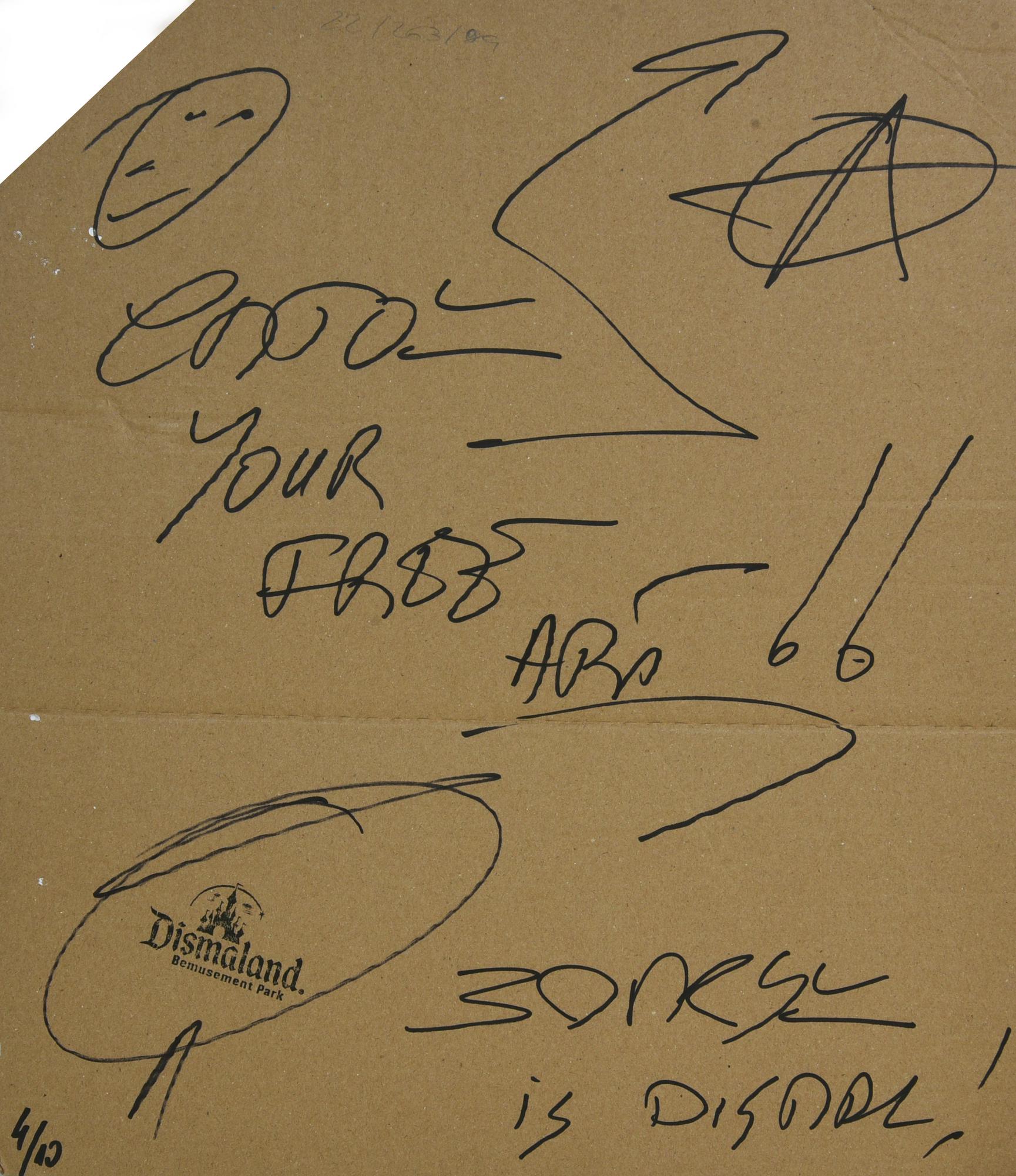 sul retro: iscritto "Enjoy your free Art. Banksy is Dismal", timbro di Dismaland
