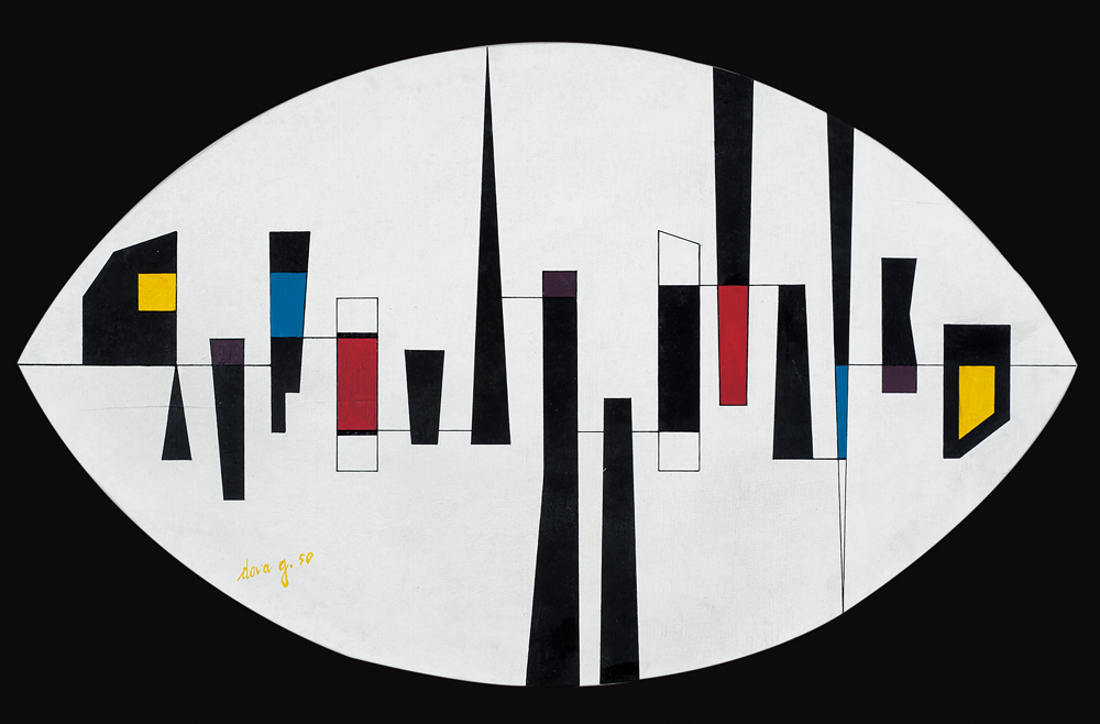 GIANNI DOVA Roma 08/01/1925 - Pisa 1991 Senza titolo, 1950 tempera su tavola ovale cm. 48,3x80, firma e anno in basso a sinistra, etichetta della Galleria Pogliani (Roma) al retro, opera registrata presso l'Archivio Gianni Dova come da dichiarazione su foto.
