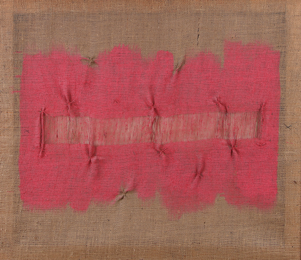 SALVATORE EMBLEMA Terzigno (Na) 25/04/1929 - Terzigno (Na) 02/02/2006 Senza titolo, 2001 terra colorata su tela di juta cm. 90x100, firma e anno al retro, dichiarazione d'autenticità dell'artista su foto.