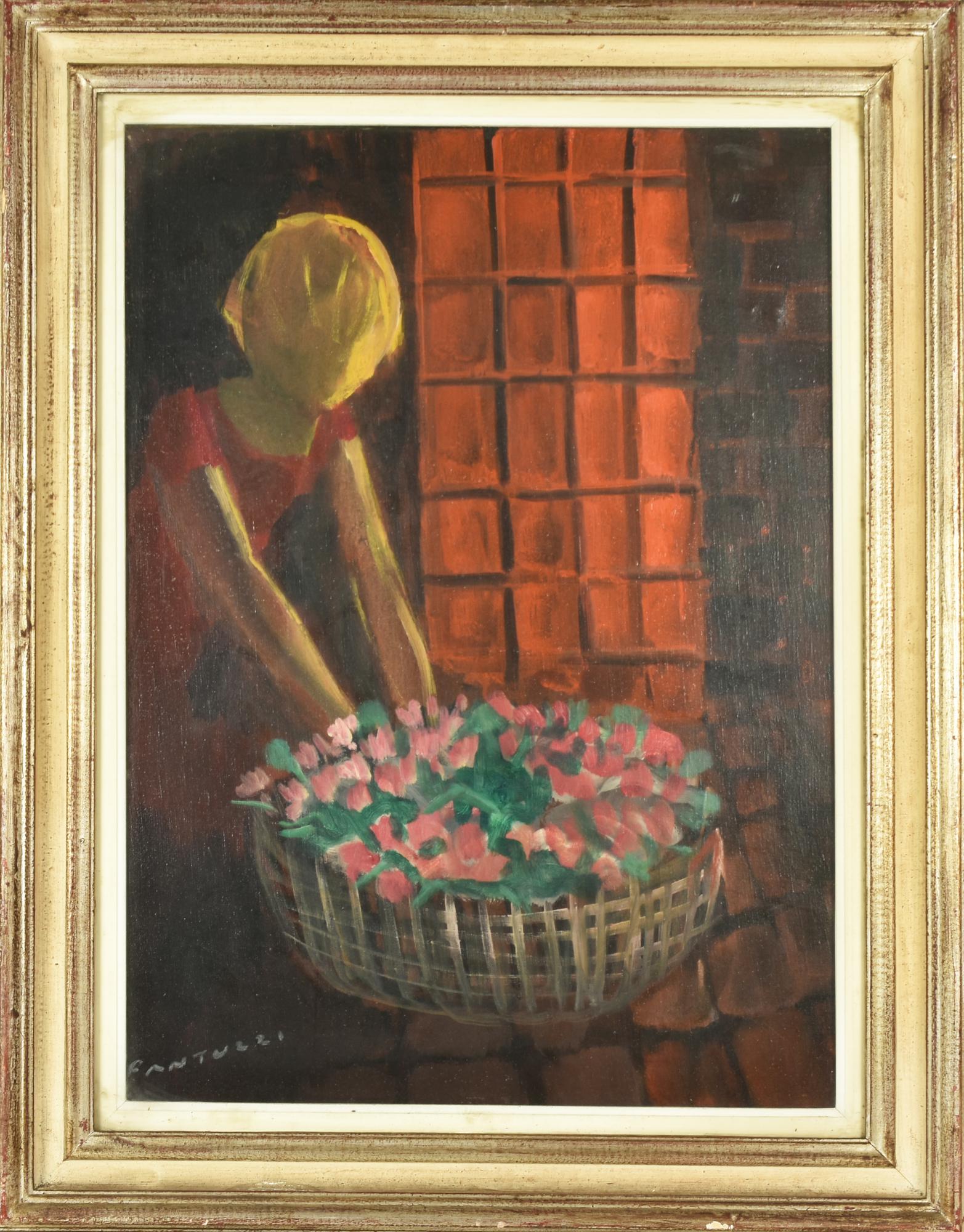 Eliano Fantuzzi FIGURA CON FIORI olio su tela, cm 70x50,5 firma sul retro:...