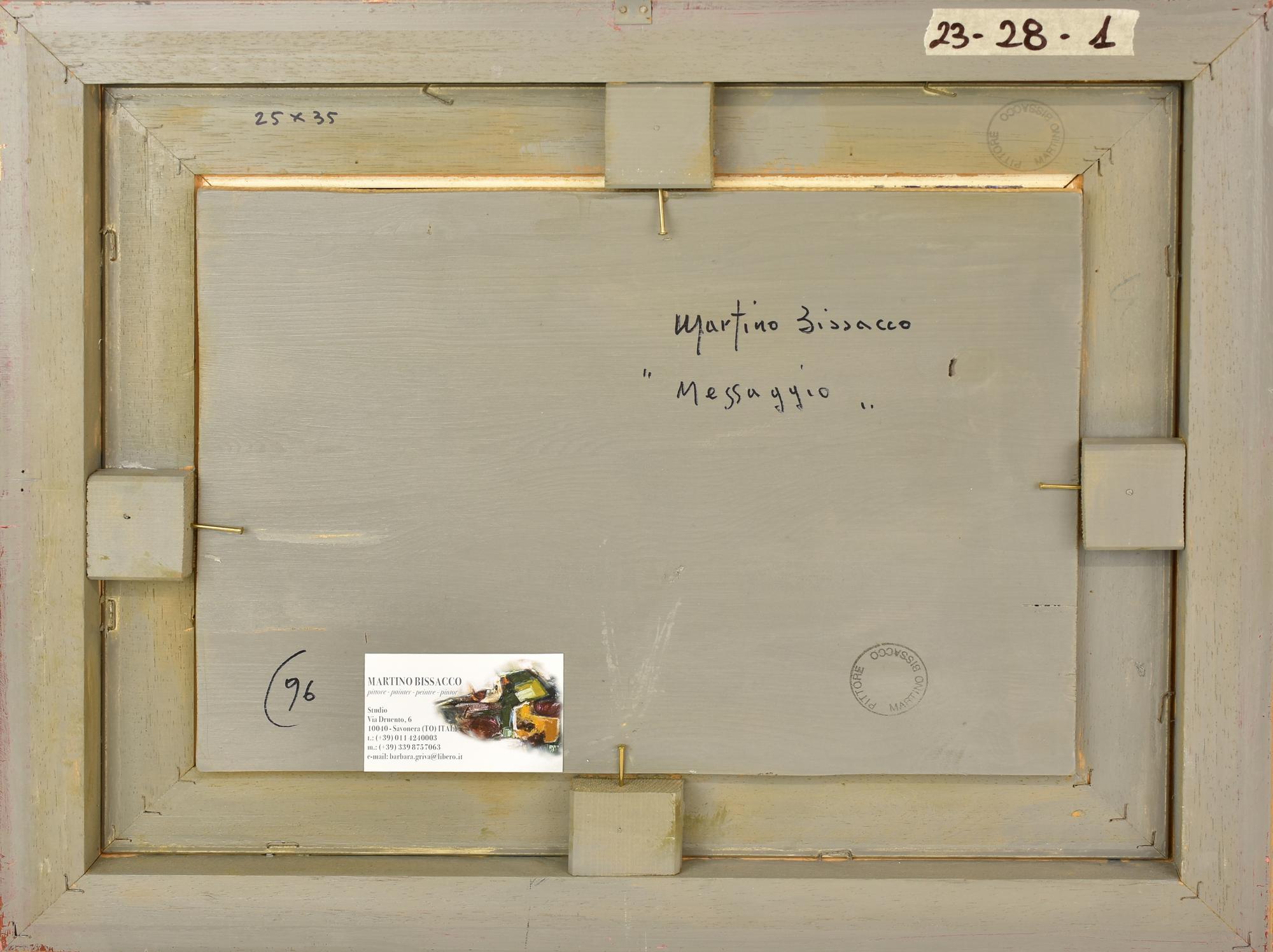 Martino Bissacco MESSAGGIO olio su tavola, cm 25x35 firma sul retro: firma e...