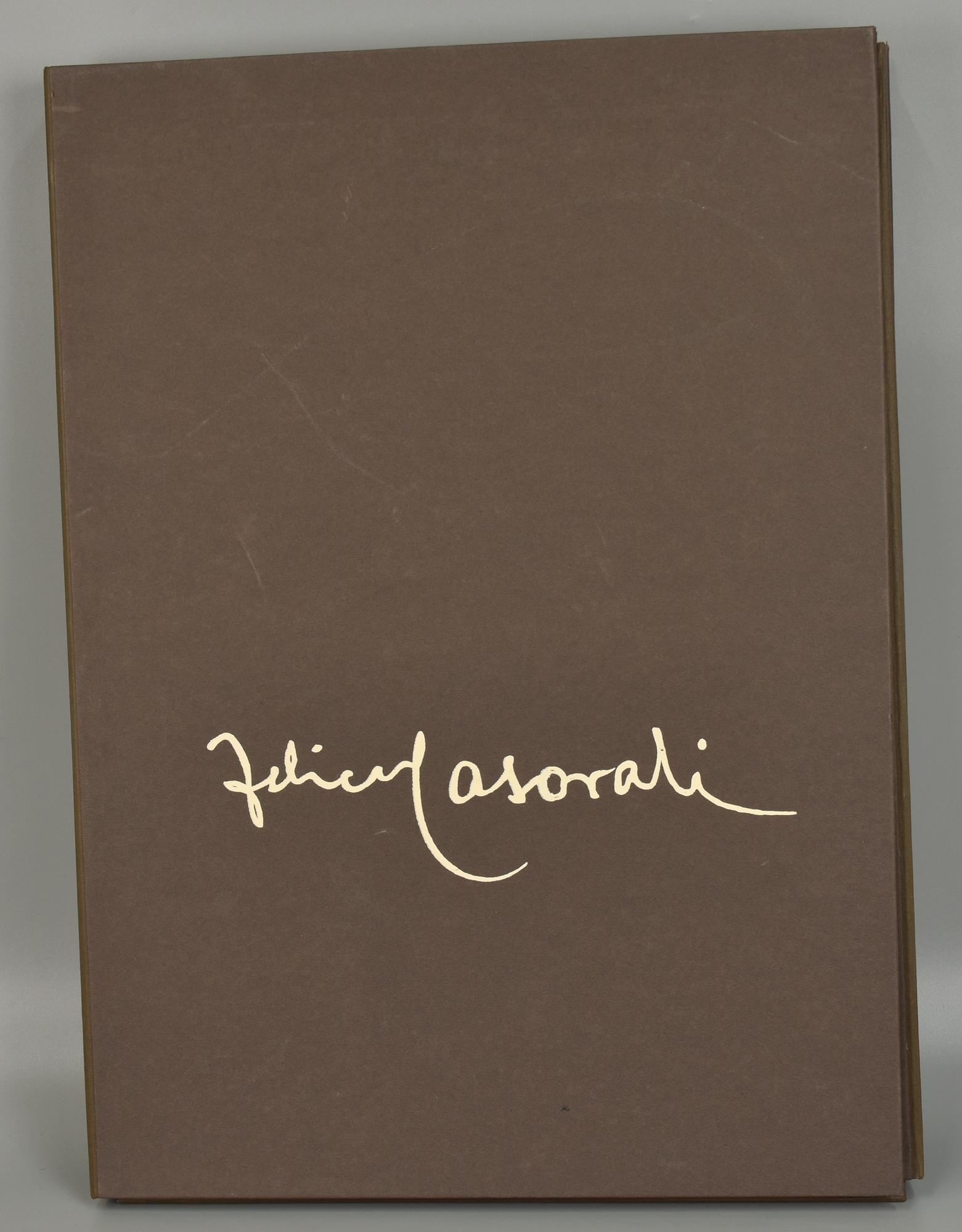 cartella in tela marrone delle 63 incisioni di Felice Casorati (anno di esecuzione, tiratura, varianti). La cartella contiene in formato originale le 63 riproduzioni delle incisioni di Casorati. Facente parte dell'edizione speciale la cartella n 44 contiene ulteriori due incisioni su cartavelina direttamente ricavate dalle matrici dell'artista, numerate e timbrate dalla vedova Daphne Maugham Casorati.