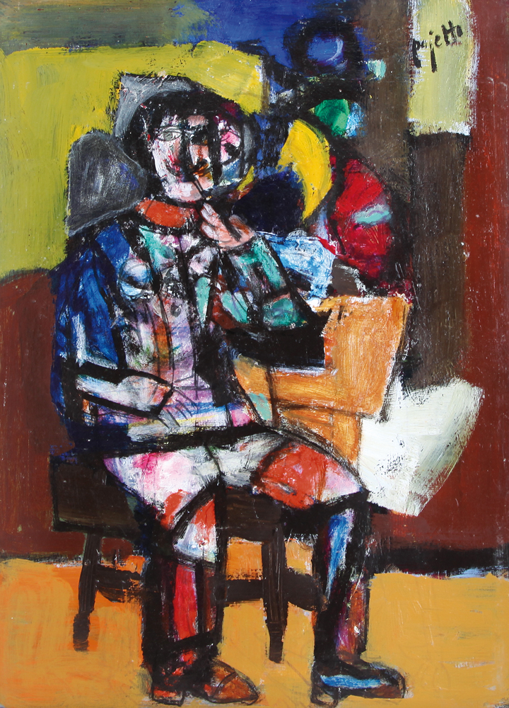 GUIDO PAJETTA Monza (Mi) 08/02/1898 - Milano 15/02/1987 Figura seduta, 1975 acrilico su cartone telato cm. 70x50, firma in alto a destra, opera registrata presso l'Archivio Guido Pajetta come da dichiarazione su foto.
