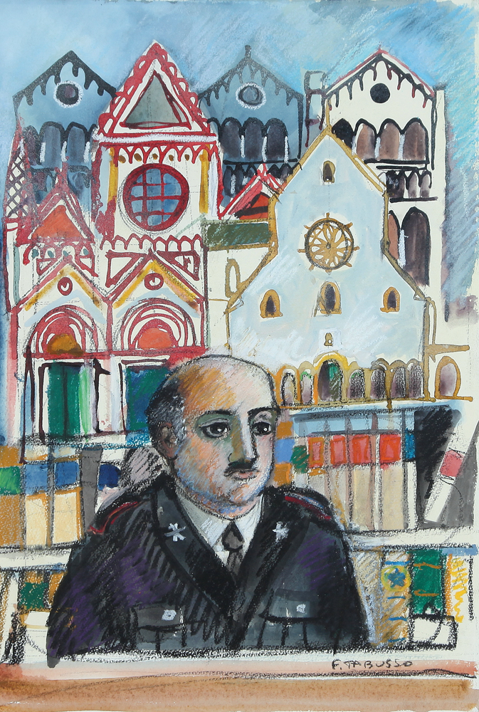 FRANCESCO TABUSSO Sesto San Giovanni (Mi) 27/06/1930  Figura e Cattedrale tecnica mista su carta cm. 57x38,5; firma in basso a destra, dichiarazione d'autenticità dell'artista su foto.