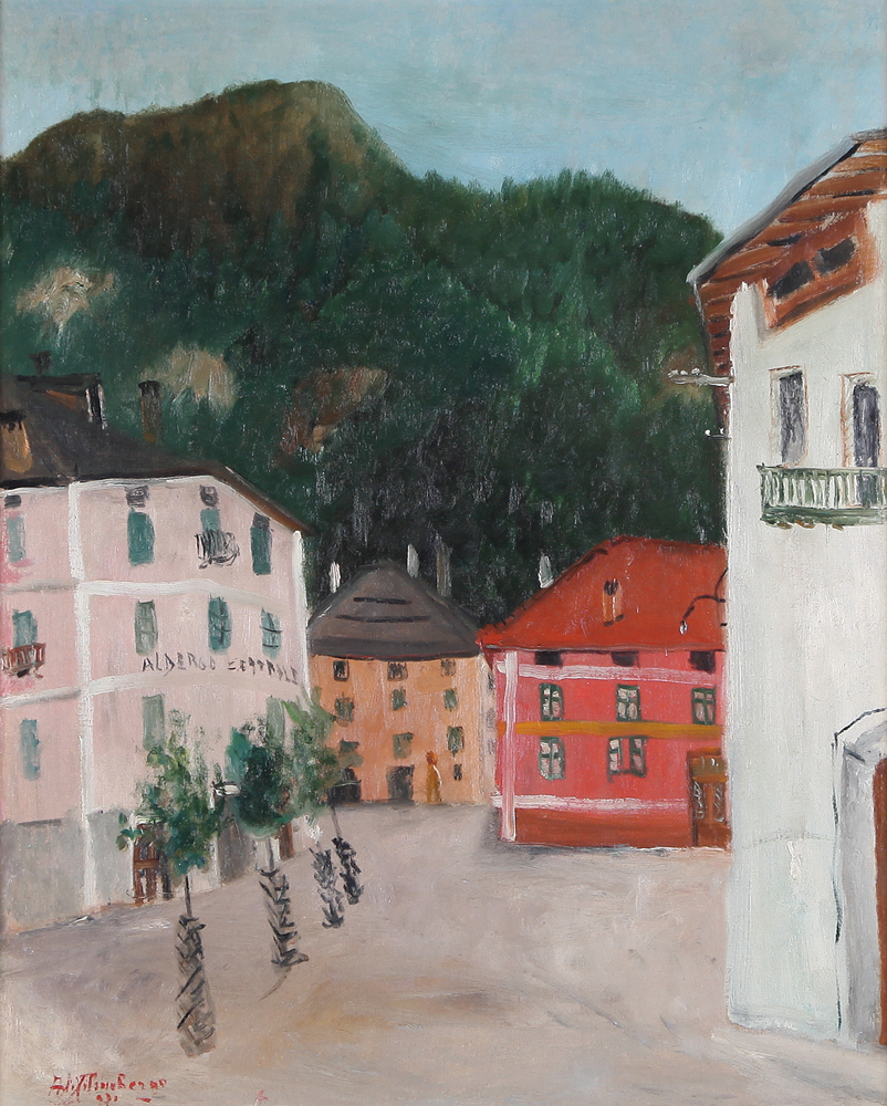 ADRIANO SPILIMBERGO Buenos Ayres (Argentina) 31/07/1908 - Milano 26/12/1975 Albergo centrale, 1932 olio su tela rintelata cm. 55x45, firma e anno in basso a sinistra, dichiarazione d'autenticità di Marianna Masutti Spilimbergo su foto, opera registrata presso l'Archivio della Galleria Ponte Rosso (MI) come da dichiarazione su foto.