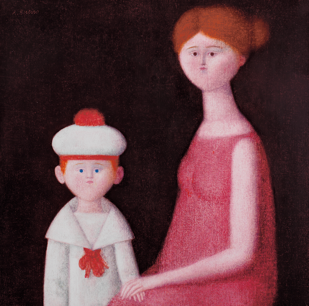 ANTONIO BUENO Berlino (Germania) 21/07/1918 - Firenze 26/09/1984 Maternità, figura con marinaretto olio su faesite cm. 40x40, firma in alto a sinistra, archivio al retro, dichiarazione d'autenticità dell'artista su foto, opera registrata presso l'Archivio Antonio Bueno come da dichiarazione su foto, pubblicata sull'invito della mostra che si è tenuta presso la Galleria Albanese Arte di Matera dal 3 al 18 dicembre 1988; pubblicata sul catalogo "Antonio Bueno, Bueno, d'après Bueno, e per conoscenza", tenutasi a Fiesole, Palazzina Mangani, ottobre 1989; Collezione Remo Squillantini (FI).