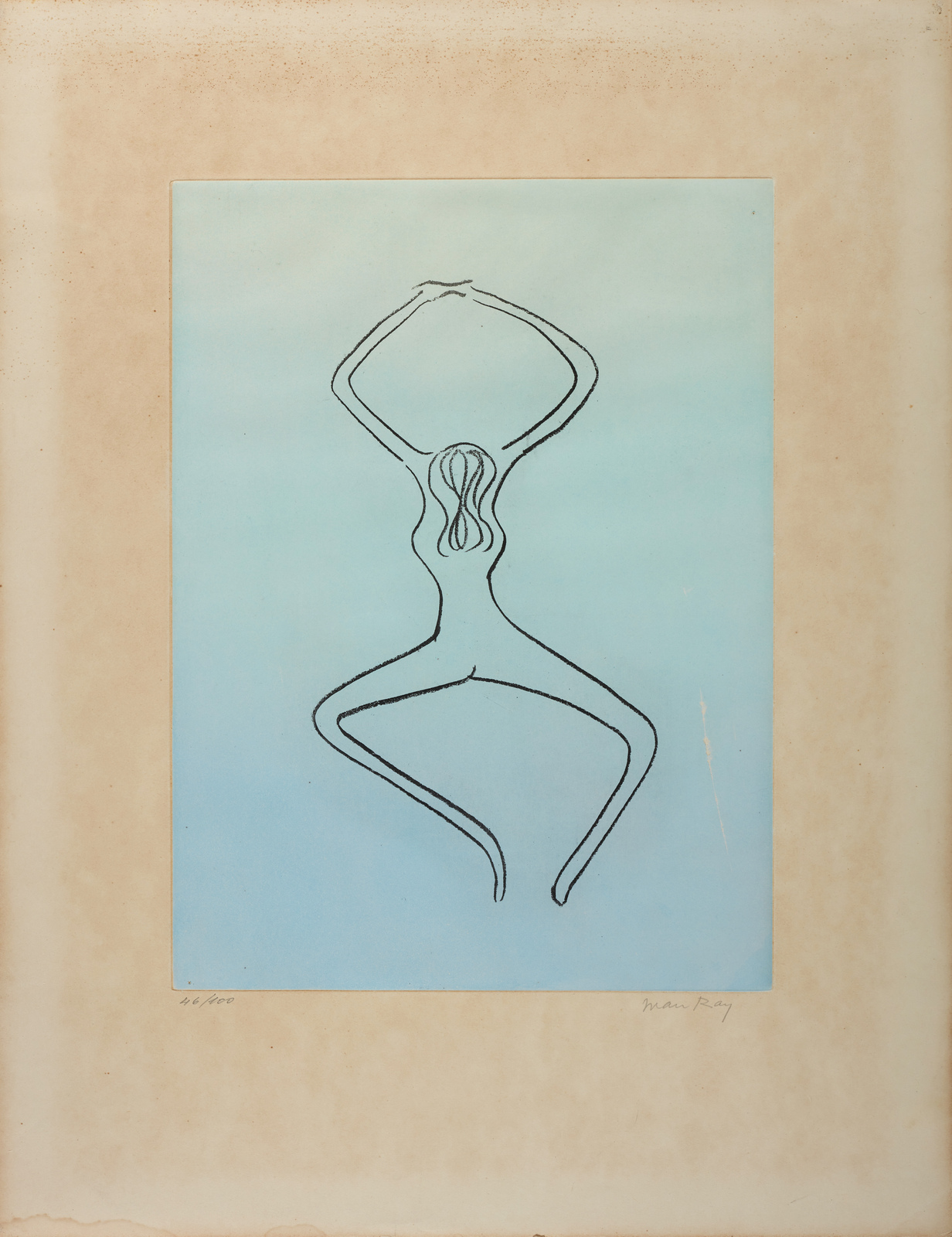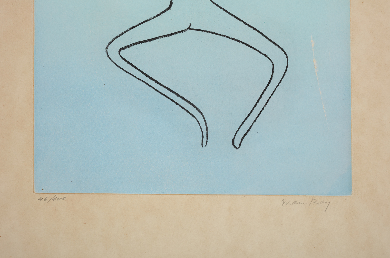 MAN RAY (1890 - 1976) Dalla cartella Les anatomes. Senza titolo. 1970. Acquaforte e acquatinta. Cm 51,00 x 66,00. 46/100. Tiratura e firma in basso a matita. Dimensione lastra: 42.7x31.7 cm. Foglio proveniente dalla cartella composta da n.11 acquaforti Les anatomes. Edizione totale: 100 esemplari + XXV. Stampatore ed Editore: Georges Visat, Parigi. Pubblicazione: Man Ray Opera Grafica. Luciano Anselmino, Ed. Mondadori 1973. Difetti.