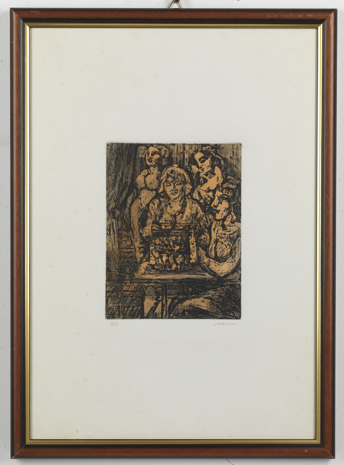 SASSU ALIGI (1912 - 2000) Senza titolo. Acquaforte. Cm 38,00 x 52,00. 16/18. Firma e tiratura in basso a matita. Dimensione lastra: 21x16 cm. Provenienza: Galleria 32, Milano; Collezione privata, Brescia. Lievi difetti. Cornice presente
