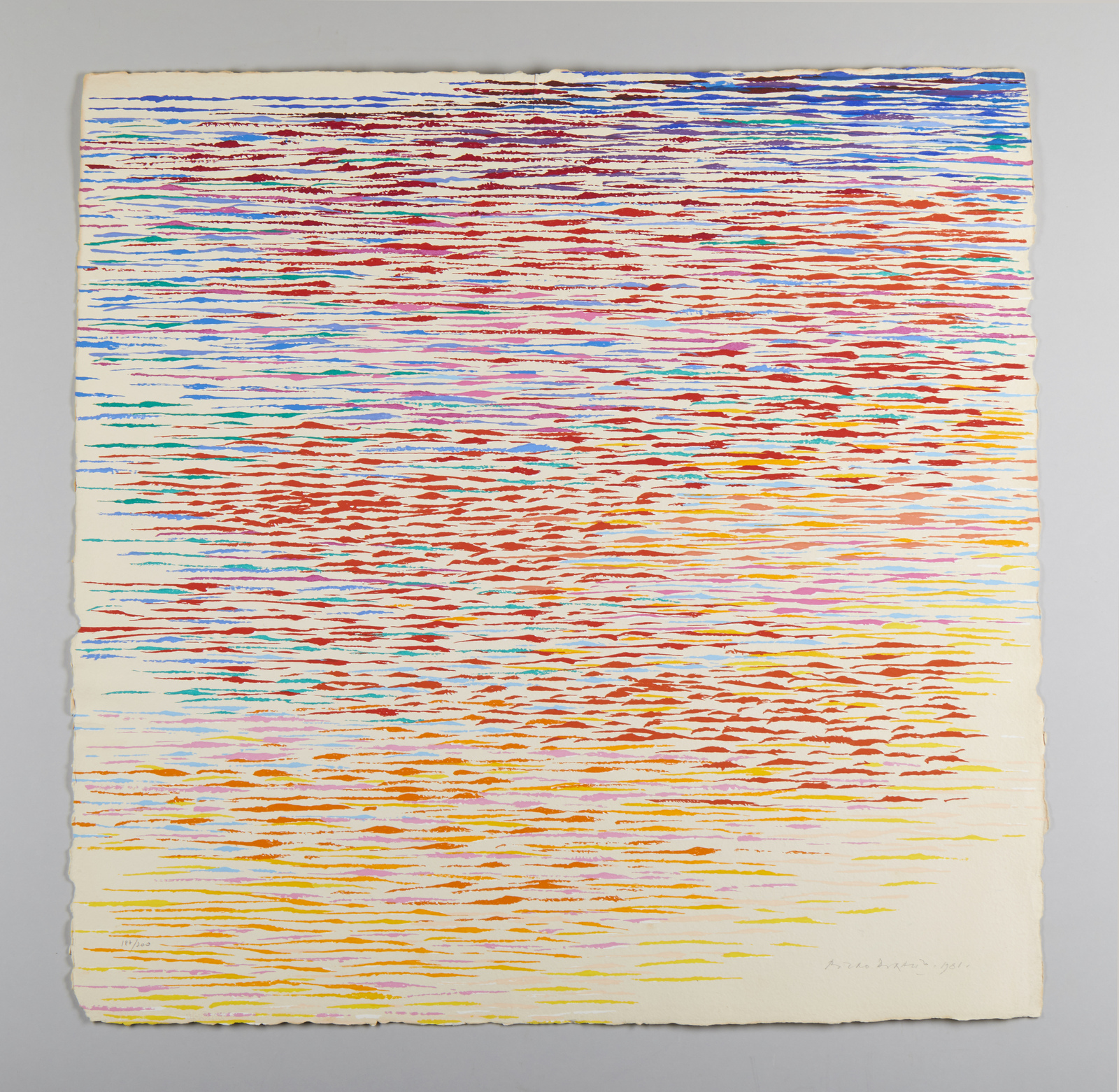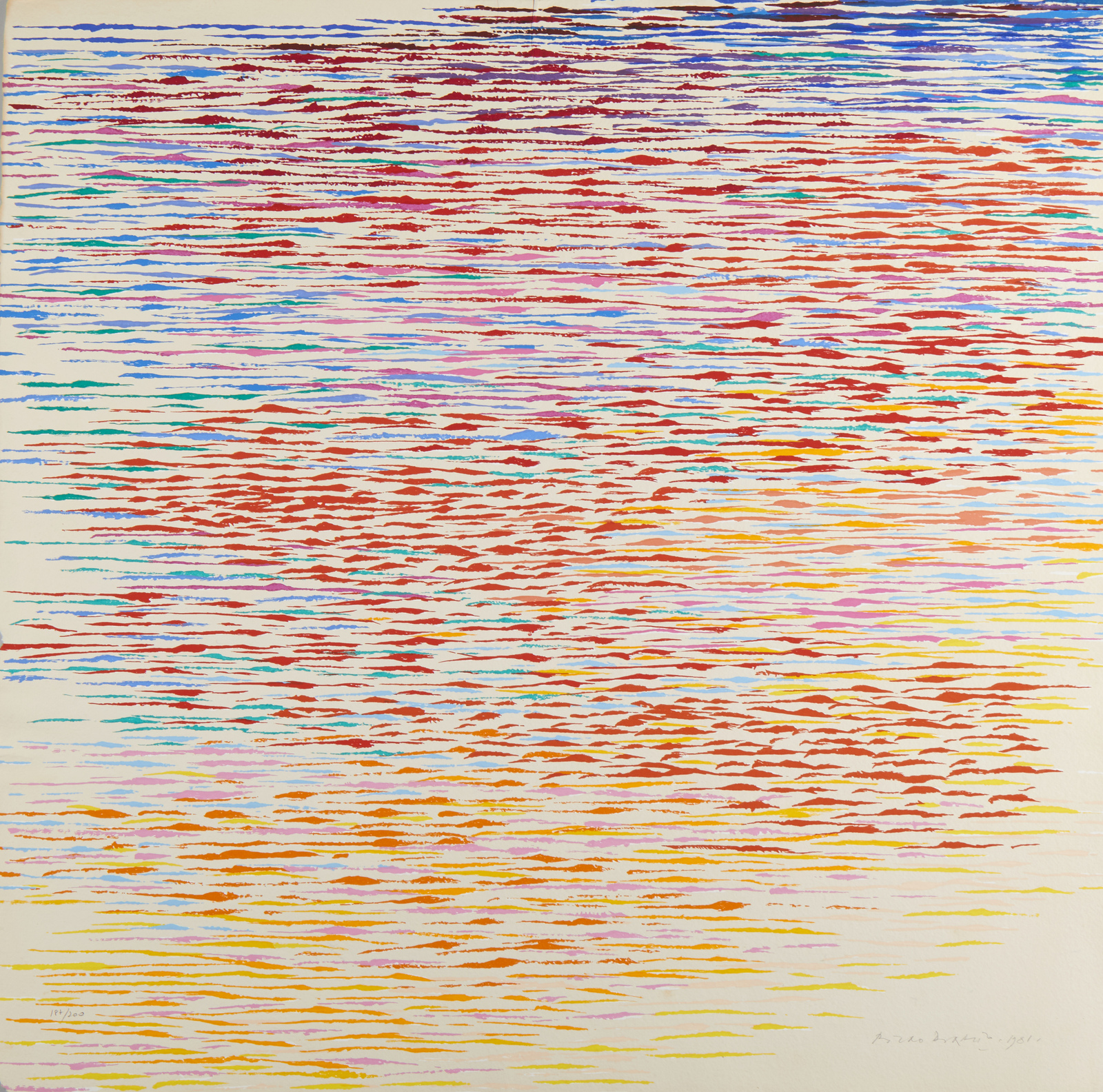 DORAZIO PIERO (1927 - 2005) Arietta n°4. 1981. Serigrafia. Cm 66,00 x 66,00. 187/200. Tiratura, firma e anno in basso a matita. Timbro a secco Ut Roma in basso a sinistra. Edizione totale: 200+25 p.d.a. esemplari. Carta Colombe Duchêne. Stampatore: Arte 3, Milano. Lievi difetti.