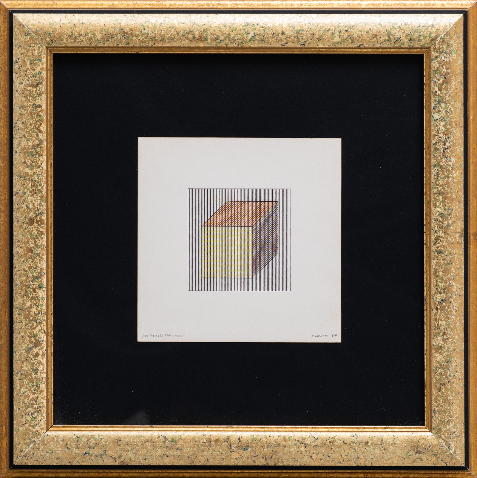 LEWITT SOL (1928 - 2007) Twelve Forms Derived From a Cube, Plate #01. 1984. Serigrafia. Cm 20,30 x 20,30. T.p.Tiratura, firma e dedica in basso a matita. Lotto proveniente dall'omonima cartella composta da n.48 serigrafie. Edizione totale: 40+10 AP+2 PP+4 TP esemplari. Carta Arches 88. Stampatore: Jo Watanabe, Takeshi Arita, Katsumi Suzuki, New York, stampa tipografica da Athoensen Press, Portland, Main. Editore: Multiples Inc., New York e Marilena Bonomo, Bari. L'opera è inserita nel Catalogo Ragionato dell'opera grafica di Sol Lewitt 1947 - 2006, a cura di Barbara Krakow Gallery (ora Krakow Witkin Gallery), con il numero 1984.05. Pubblicazioni: Sol LeWitt: Prints 1970-1986. Londra: Tate Gallery Publications, 1986. Sol LeWitt Tate Gallery, p. 56. Sitografia: https://www.sollewittprints.org/artwork/lewitt-raisonne-1984-05/. Cornice presente