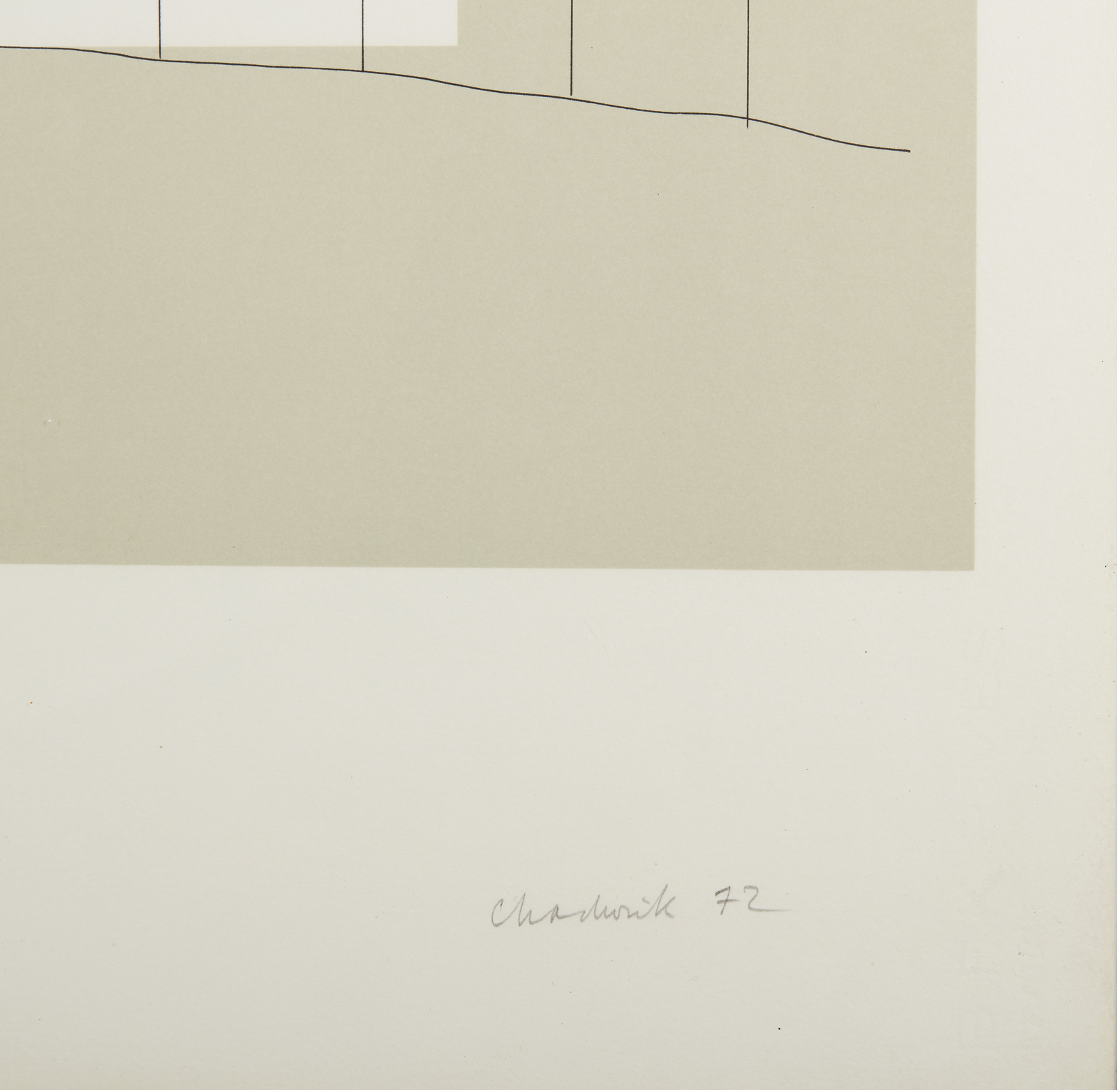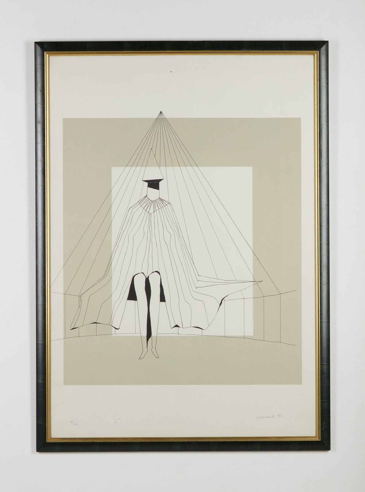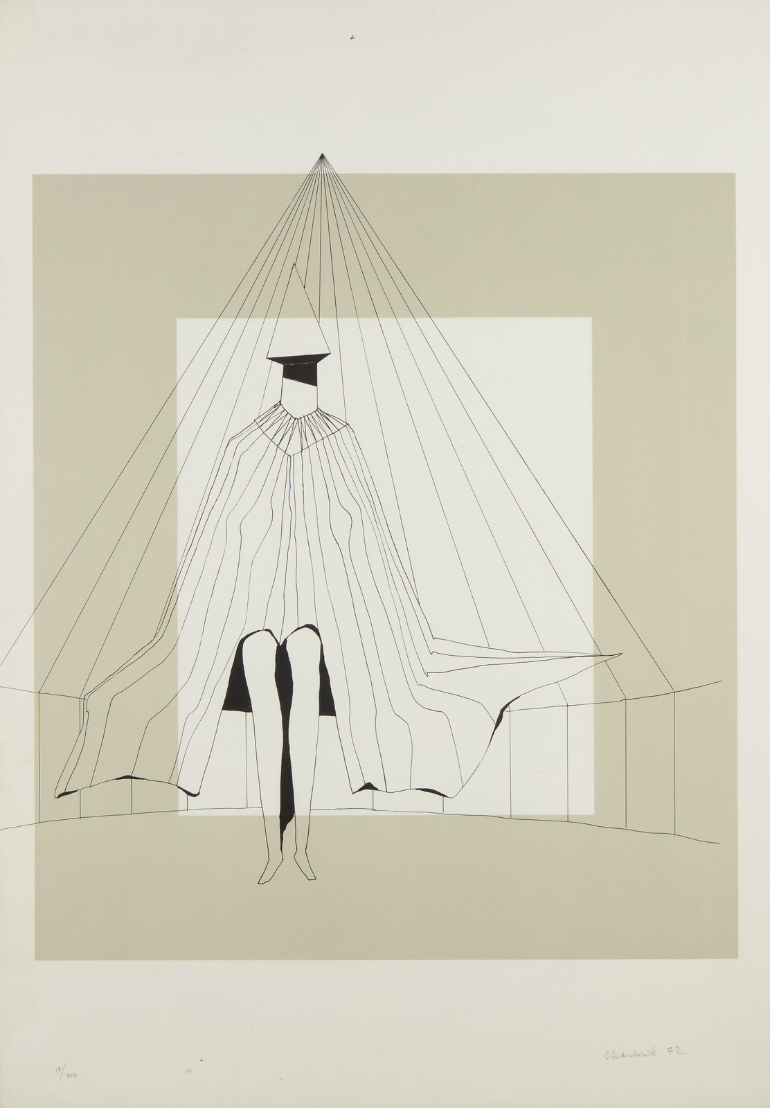 LYNN CHADWICK (1914 - 2003) One standing figure. 1972. Serigrafia. Cm 63,50 x 87,50. 17/100. Tiratura, firma e anno in basso a matita. Timbro a secco Erker Presse St Gallen, in basso a sinistra. Filigrana BFK Rivers, France, a destra. Edizione totale: 100 esemplari + qualche p.a. Difetti. Cornice presente