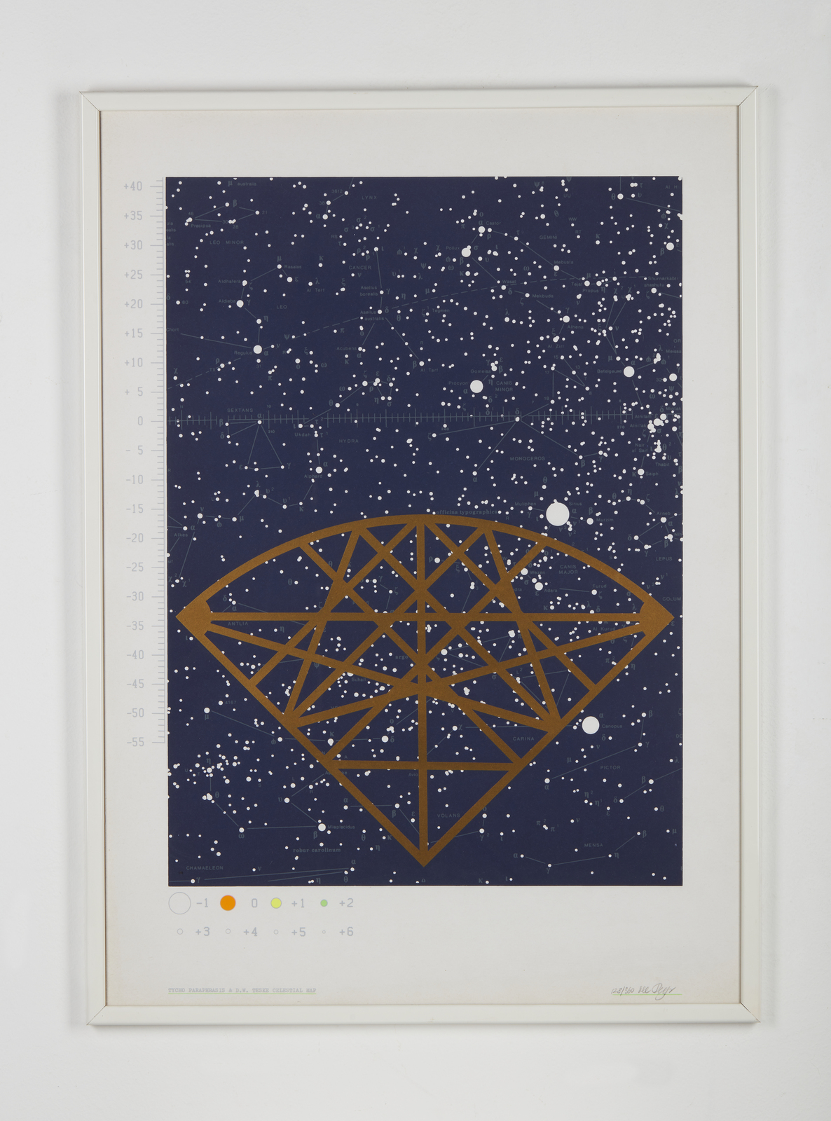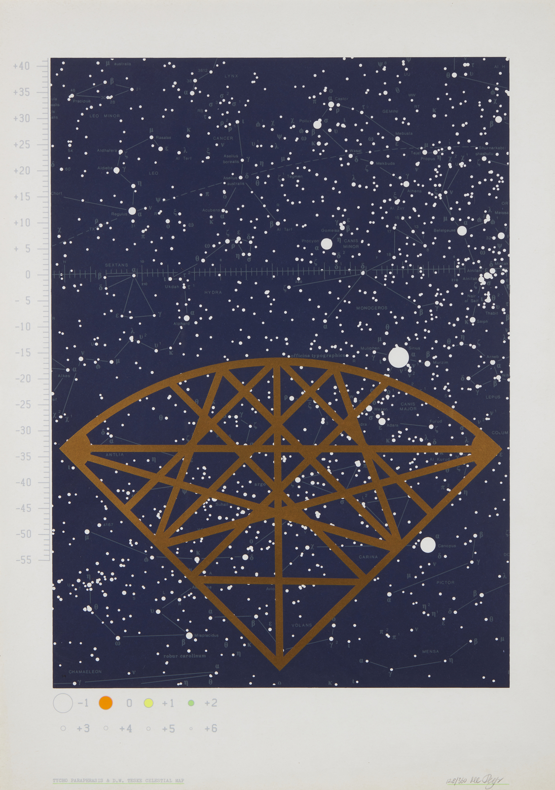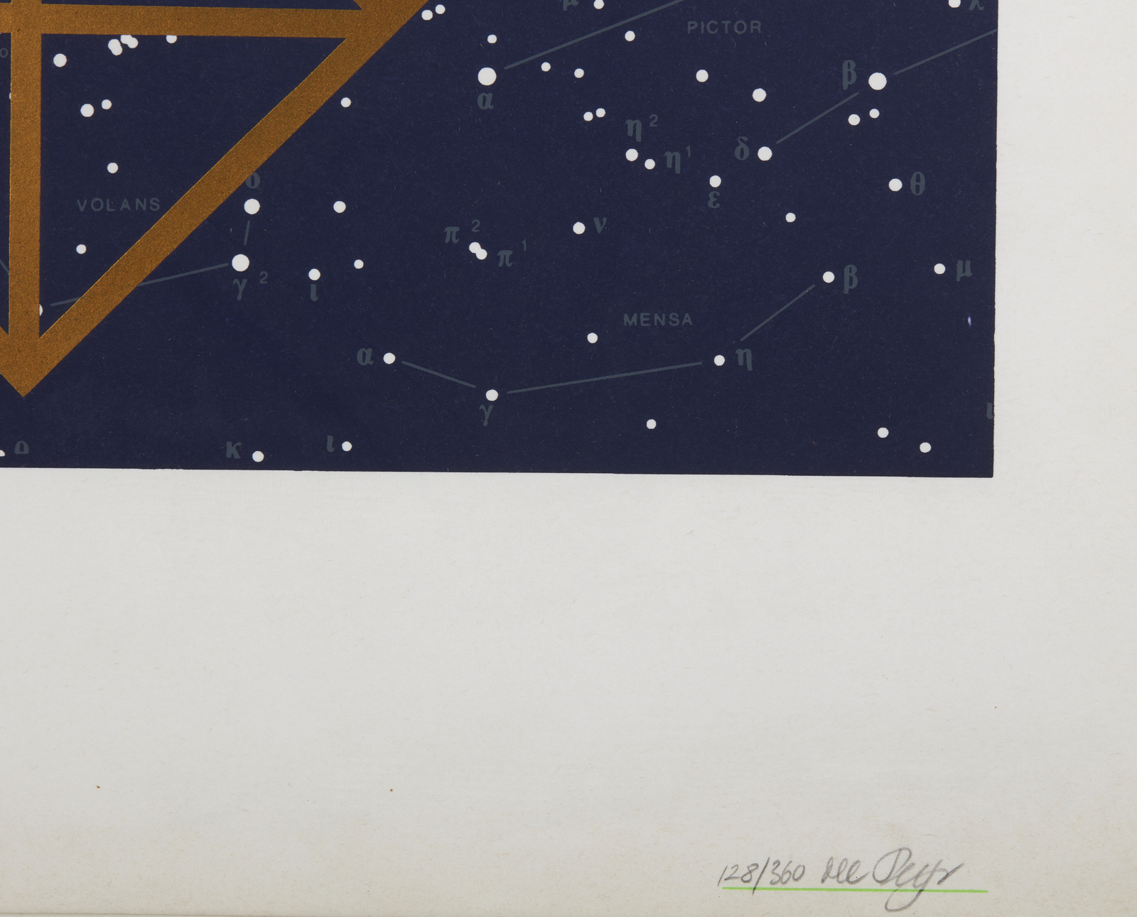 DEL PEZZO LUCIO (n. 1933) Tycho Paraphrasis & D.W. Teske celestial map. . 1981. Serigrafia. Cm 50,00 x 70,00. 128/360. Tiratura e firma in basso a matita. Edizione totale: 360 esemplari numeri arabi + XV numeri romani + prove d'artista. Esposizioni: 12 artisti per l’Alfa Romeo. Arte e tecnologia, concessionarie Alfa Romeo, varie città, 5 novembre 1981. Cornice presente
