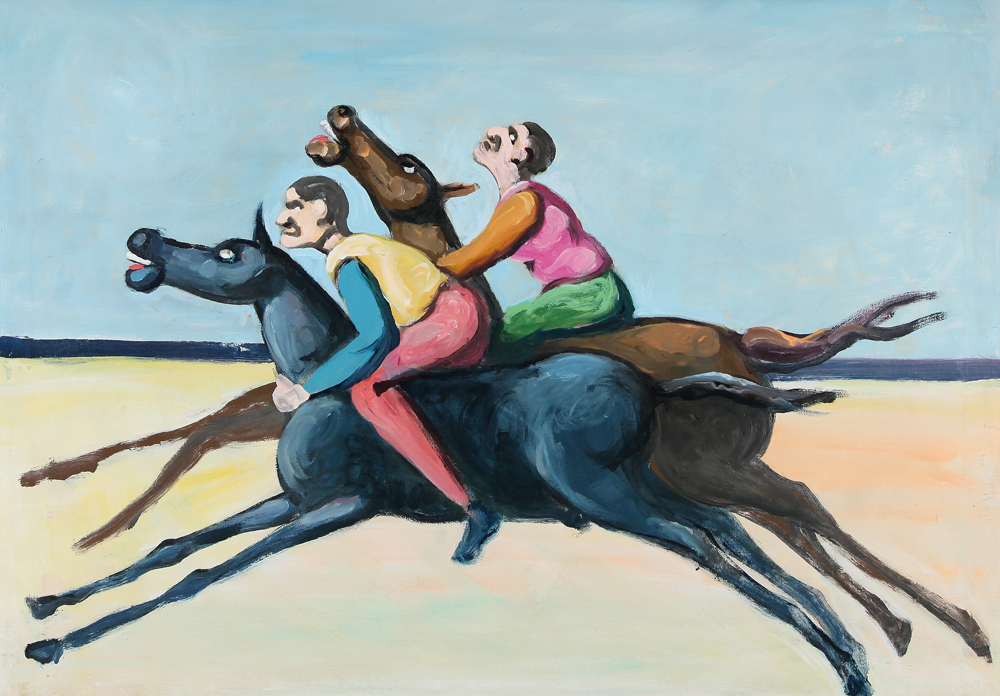 POMPEO BORRA Milano 28/01/1898 - Milano 05/11/1973 Cavalieri sulla spiaggia, 1967 olio su tela cm. 70x100, firma ed etichetta della mostra antologica tenutasi nel 1985 presso il Comune di Verona, Galleria d'arte moderna e contemporanea al retro, dichiarazione d'autenticità di Filippo Caracciolo Borra su foto.