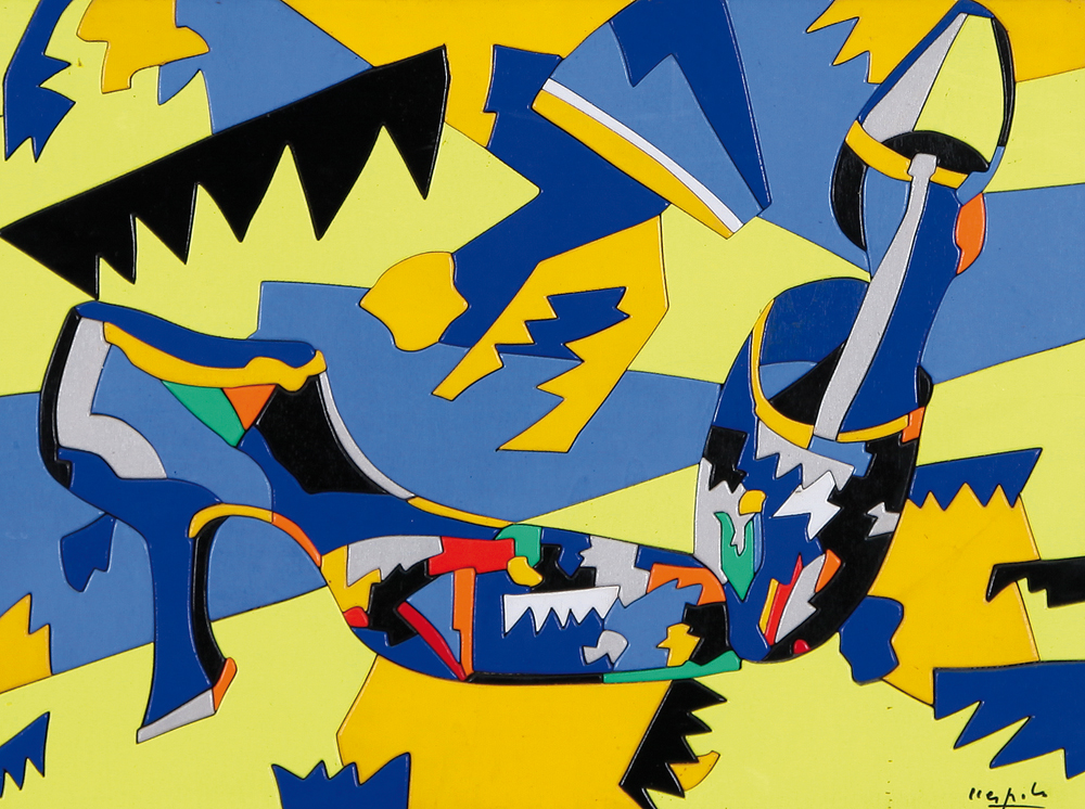 UGO NESPOLO Mosso Santa Maria (Bi) 29/08/1941 Le scarpette sghembe acrilico e intarsio su tavola cm. 30x40, firma in basso a destra, titolo e firma al retro, dichiarazione d'autenticità dell'artista su foto.