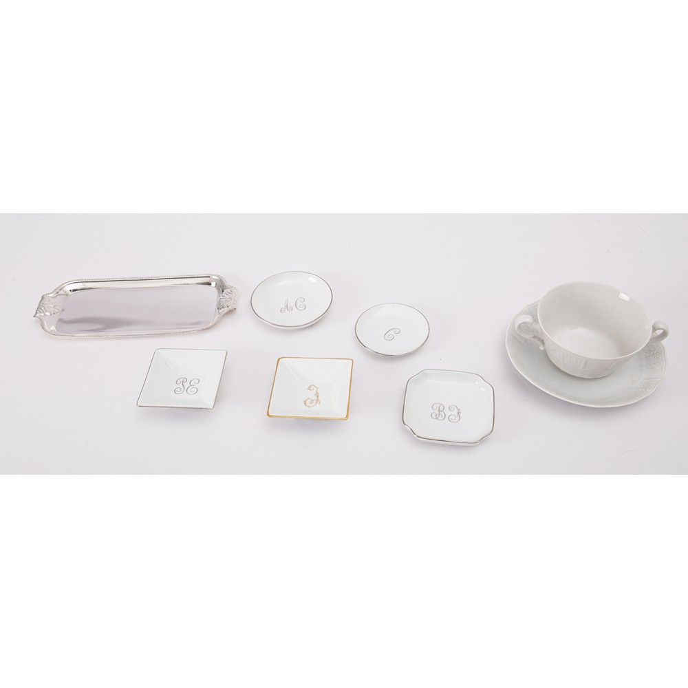 Una raccolta di 18 pezzi così suddivisa: Heinrich 12 tazze da brodo in porcellana bianca con piattino, un piccolo vassoio in Sheffield, 5 piattini Ginori in porcellana bianca con monogrammi.