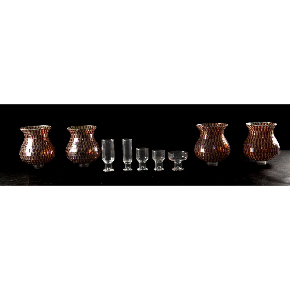 Una raccolta di 60 pezzi così suddivisa: Arabia bicchieri in cristallo modello “Helm” 28 coppe macedonia, 8 bicchieri vino rosso, 8 bicchieri birra, 4 bicchieri cocktail, 12 flute, 4 diffusori in mosaico di vetro nei toni del rosso.
