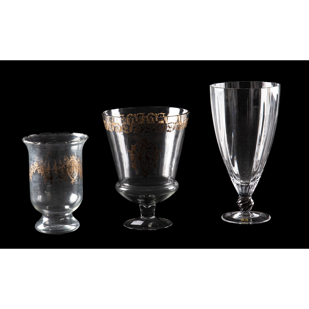 Una raccolta di tre vasi in vetro trasparente, due con decori a ramage in oro e uno con coppa ovalizzata congiunto alla base circolare da un a sfera a torchon.