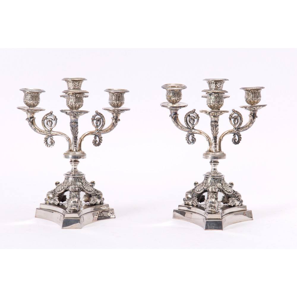 Coppia di importanti candelabri a 5 fiamme, base sostenuta da delfini, bracci con volute, portacandele decorati con motivi fogliacei