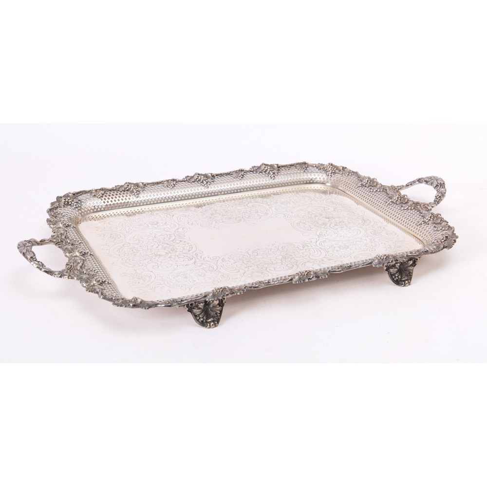 Importante e grande vassoio rettangolare in old Sheffield, bordo traforato e decorato con grappoli d’uva, piano decorato a motivi incisi, piedini mossi e manici decorati (un piede da saldare).