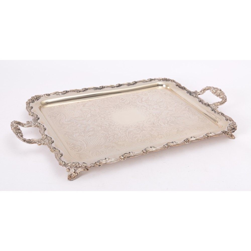 Grande vassoio rettangolare in old Sheffield, bordo mosso e decorato con volute, piano decorato a motivi incisi, piedini mossi e manici decorati.