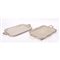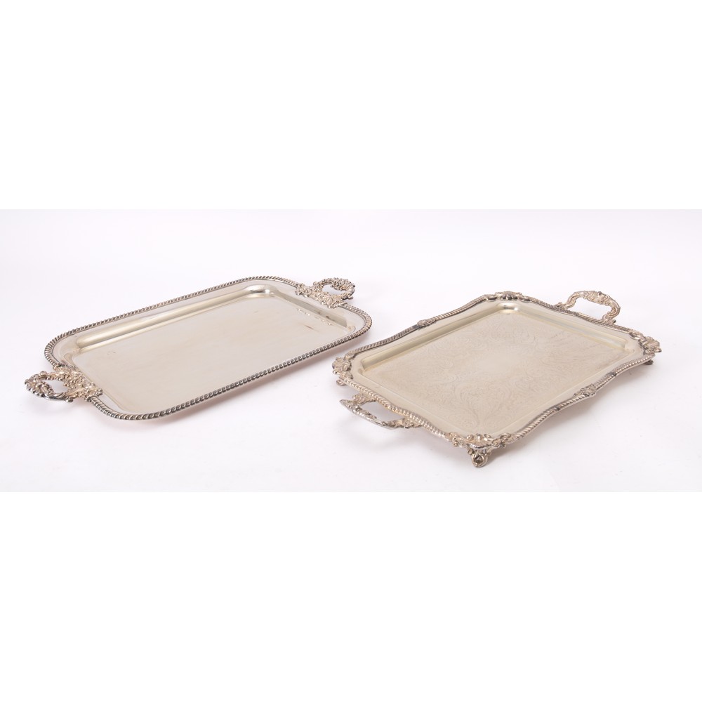 Due vassoi rettangolari in old Sheffield, uno con bordo cordonato e manici decorati con motivi floreali, uno bordo mosso e cordonato, angoli con palmette, piedini mossi e manici decorati.