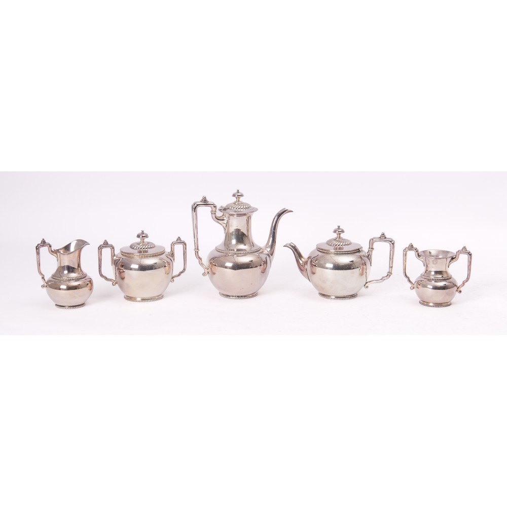 Servizio cinque pezzi in old Sheffield composto da Teiera, caffettiera, zuccheriera, lattiera e vaso contenitore, base e coperchi cordonati.