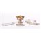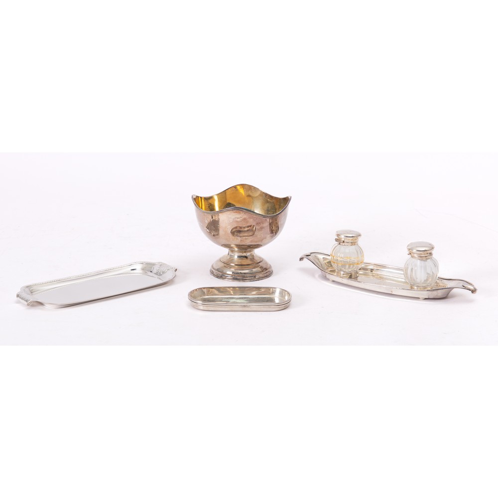 Una raccolta di 4 oggetti così suddivisa: un calamaio in old Sheffield con due ampolle in cristallo trasparente baccellato, una coppa in Sheffield con corpo sferico e bordo mosso, due piccoli vassoio rettangolari in Sheffield.