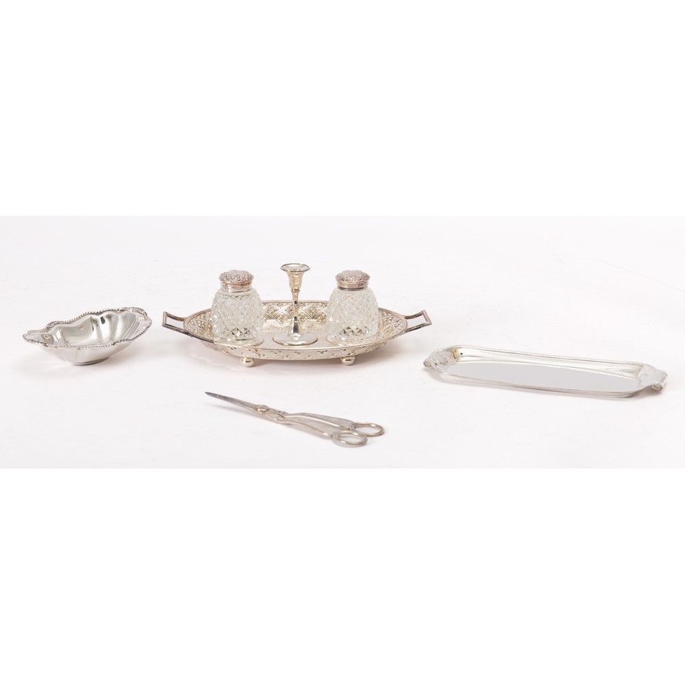 Una raccolta di 4 oggetti così suddivisa: un calamaio in old Sheffield con monocera e due ampolle in cristallo trasparente sfaccettato, una ciotolina in Sheffield con corpo ovalizzato e bordo mosso, un piccolo vassoio rettangolare in Sheffield, una forbice in Sheffield.