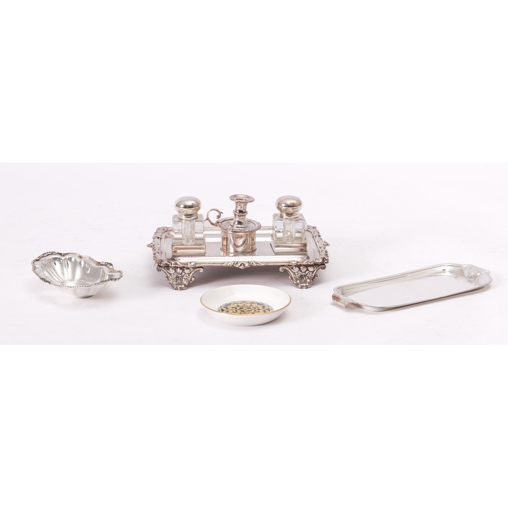 Una raccolta di 4 oggetti così suddivisa: un calamaio in old Sheffield con monocera e due ampolle in cristallo trasparente, una ciotolina in Sheffield con corpo ovalizzato e bordo mosso, un piccolo vassoio rettangolare in Sheffield, una ciotola in porcellana bianca con bordo oro, decoro centrale giallo e blu.