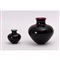 Due vasi di forma a boccia di diversa dimensione, uno più grande in vetro nero incamiciato rosso, uno più piccolo in vetro nero incamiciato verde.