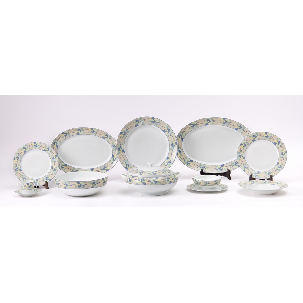 Servizio piatti modello “Otero” in porcellana bianca decorata con motivi vegetali blu e giallo su fondo beige da 68 pezzi così suddiviso: 24 piatti piani, 12 piatti fondi, 12 piatti frutta, una zuppiera, un’insalatiera, una salsiera, 2 raviere, un piatto portata circolare, un piatto da portata ovale, 12 tazze caffé con piattino.