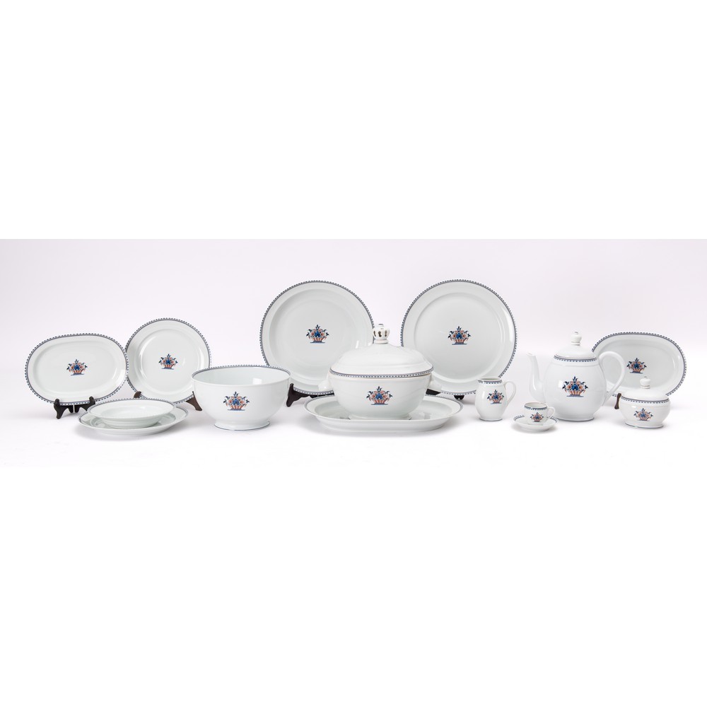 Servizio piatti modello “Vieux Rouen” in porcellana Limoges bianca decorato con cesto di fiori blu e rosso da 71 pezzi così suddiviso: 24 piatti piani, 12 piatti fondi, 12 piatti frutta, una zuppiera, un’insalatiera, una salsiera, 2 raviere, 2 piatti da portata circolari, un piatto da portata ovale, caffettiera, lattiera, zuccheriera e 12 tazze caffé con piattino.