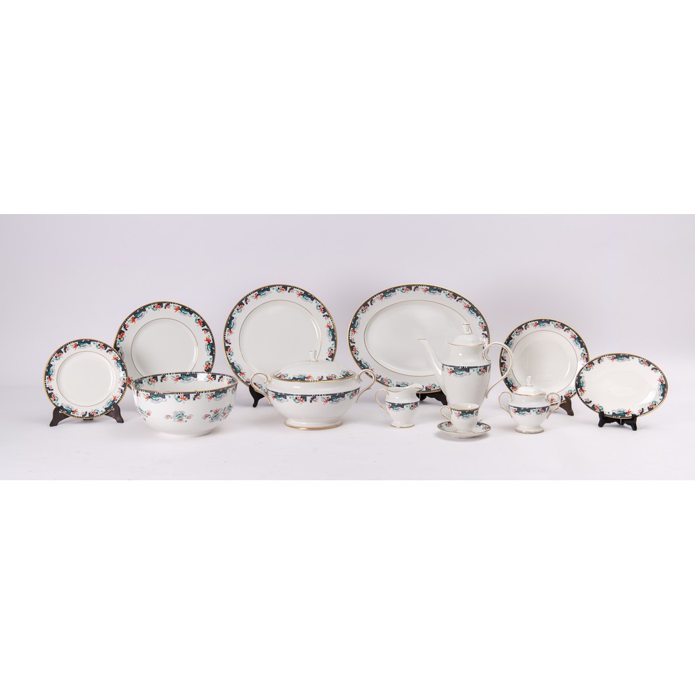 Servizio piatti modello “Penang” in porcellana bone china bianca con decori floreali policromi da 93 pezzi così suddiviso: 48 piatti piani, 12piatti fondi, 11piatti frutta, una zuppiera, un’insalatiera, una raviera, 2 piatti da portata circolari, 2 piatti da portata ovali, 12 tazze caffé con piattino, una caffettiera, una lattiera, una zuccheriera.
