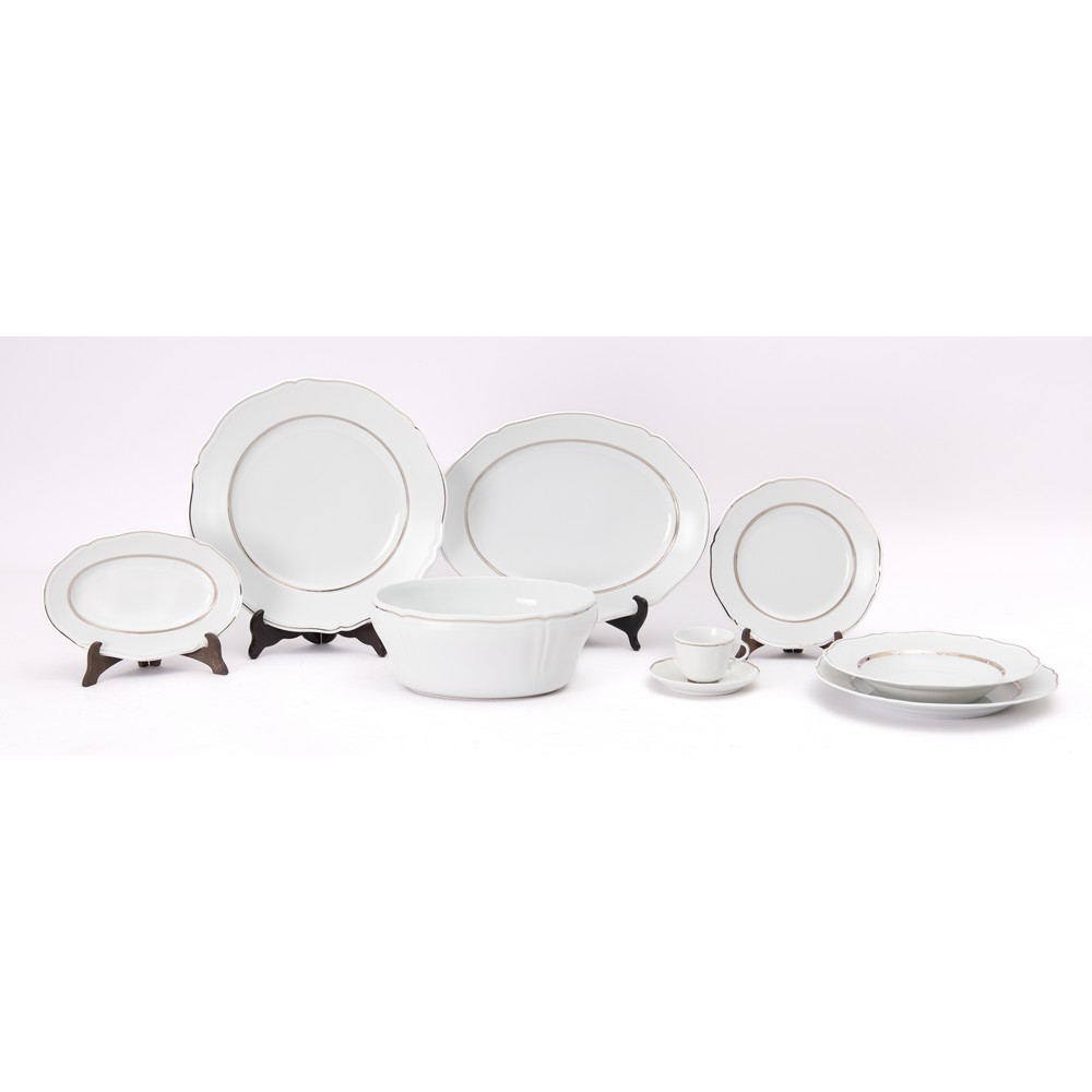 Servizio piatti modello “Antico Doccia“ in porcellana bianca decorata con bordo argento, da 63 pezzi così suddiviso: 24 piatti piani, 12 piatti fondi 12 piatti frutta, una insalatiera, una raviera, un piatto da portata circolare, un piatto da portata ovale, 11 tazze caffé con piattino.