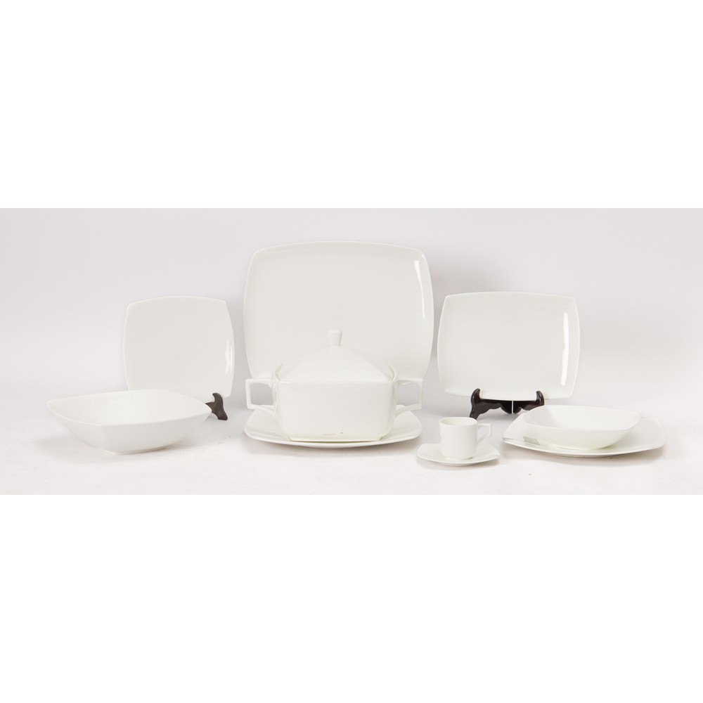 Servizio piatti modello ”Vela” in porcellana bianca composto da 65 pezzi così suddiviso: 24 piatti piani, 12 piatti fondi, 12 piatti frutta, una zuppiera, un’insalatiera, una riviera, 2 piatti da portata uno quadrato e uno rettangolare, 12 tazze caffé con piattino.