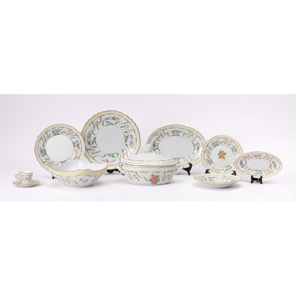 Servizio "Vecchio Ginori" in porcellana bianca decorata a motivi floreali policromi composto da 65 pezzi cosi suddivisi: 24 piatti piani, 12 fondi, 12 frutta, una zuppiera, due raviere, insalatiera, due piatti a servire e 12 tazze da caffè con piattino.