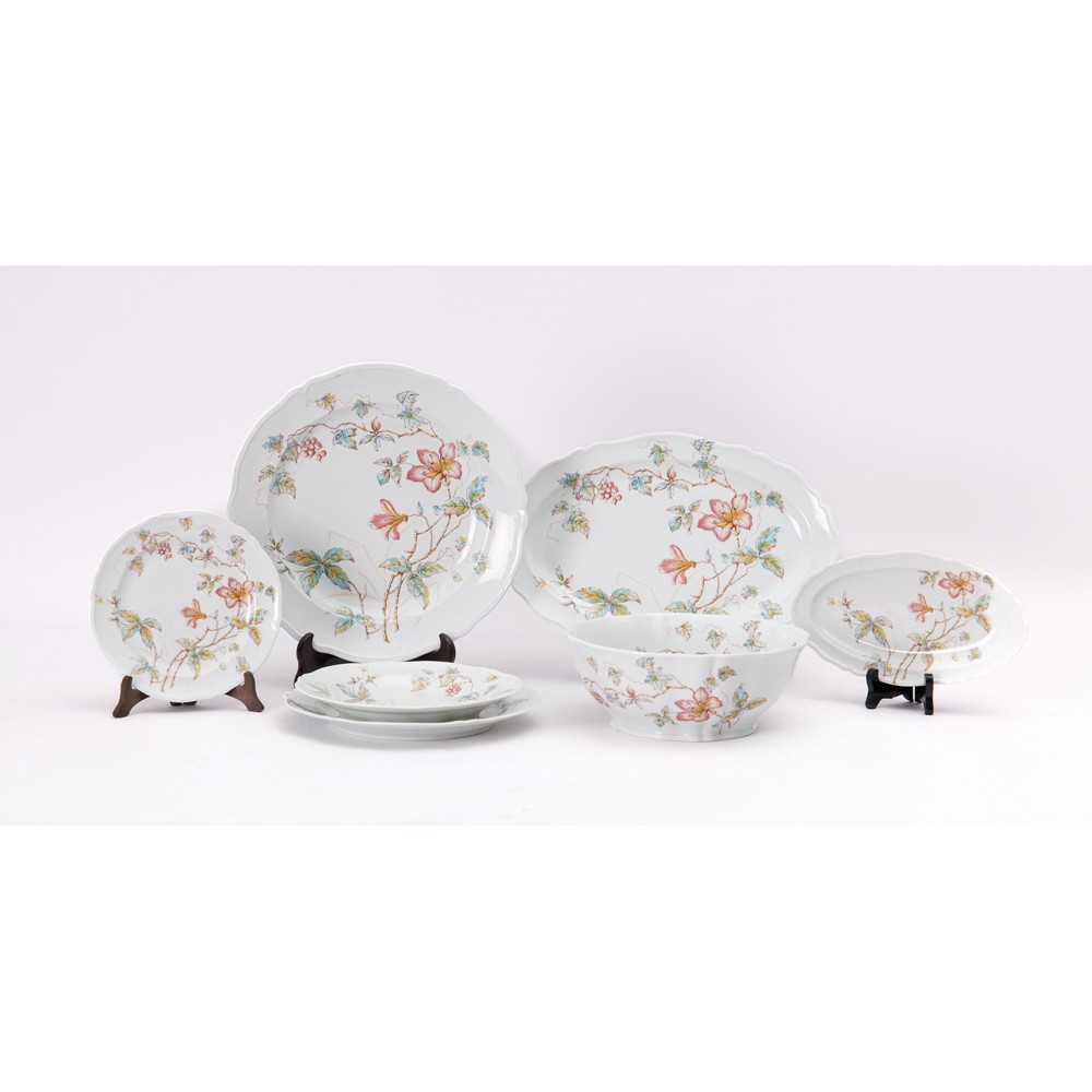 Servizio piatti in porcellana bianca decorata a motivi floreali policromi composto da 52 pezzi cosi suddivisi: 24 piatti piani, 12 fondi, 12 frutta, una raviera, un'insalatiera, due piatti a servire.