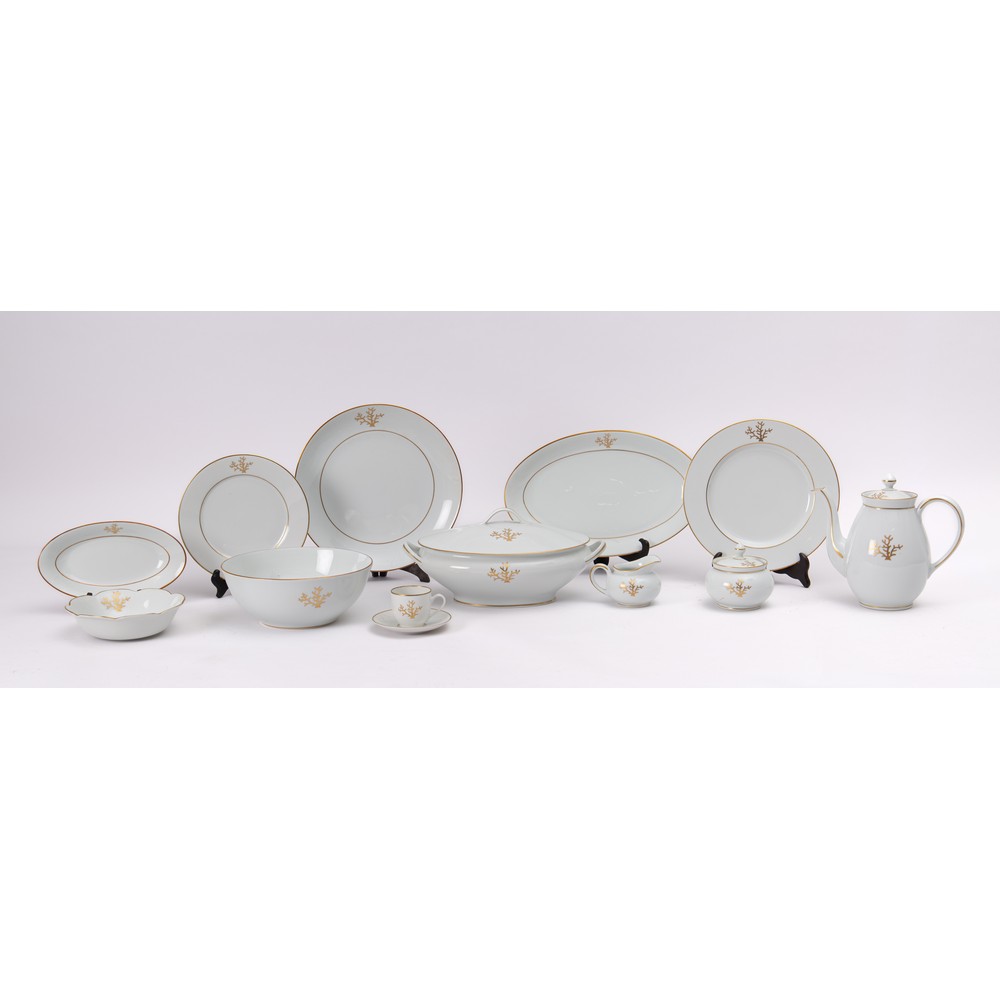 Servizio piatti modello ”Le Roi Corail” in porcellana bone china bianca decorata con rami di corallo oro composto da 65 pezzi così suddiviso: 24 piatti piani, 12 piatti fondi, 12 piatti frutta, una zuppiera, un’insalatiera, un piatto da portata ovale, piatto da portata circolare, una raviera, 12 tazze caffé con piattino, una caffettiera, una lattiera e una zuccheriera.