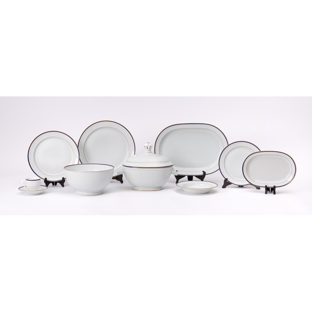Servizio piatti modello “Samarra Blanc” in porcellana Limoges bianca decorato con bordo blu da 64 pezzi così suddiviso: 24 piatti piani, 11 piatti fondi, 12 piatti frutta, una zuppiera, una insalatiera, un piatto da portata circolare, due piatti da portata ovale, 12 tazze caffé con piattino.