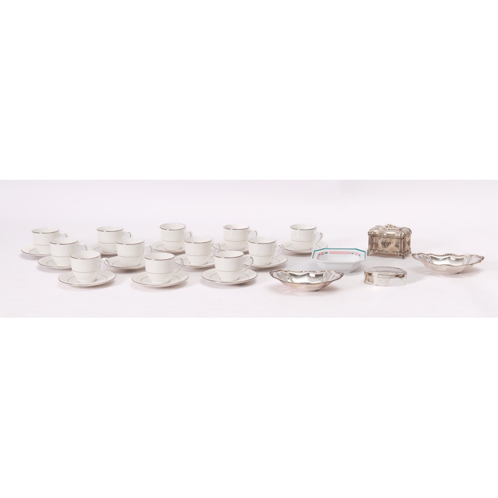 Una raccolta di 17 pezzi così suddivisa: Lenox 12 tazze caffé con piattino in porcellana bone china bianca con perfilo argento, due scatole in Sheffield, due ciotole di forma ovale in Sheffield, un posacenere Coquet modello “Fiju” in porcellana bianca con decori rosa e verde.