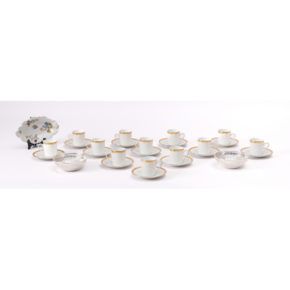 Una raccolta di 16 pezzi così suddivisa: Porcelaine Sologne 12 tazze caffé con piattino in porcellana bianca con bordo oro, Haviland piatto a forma di foglia in porcellana bianca e decorata a motivi floreali policromi, due ciotoline in Sheffield di forma circolare con lavorazione a traforo.