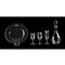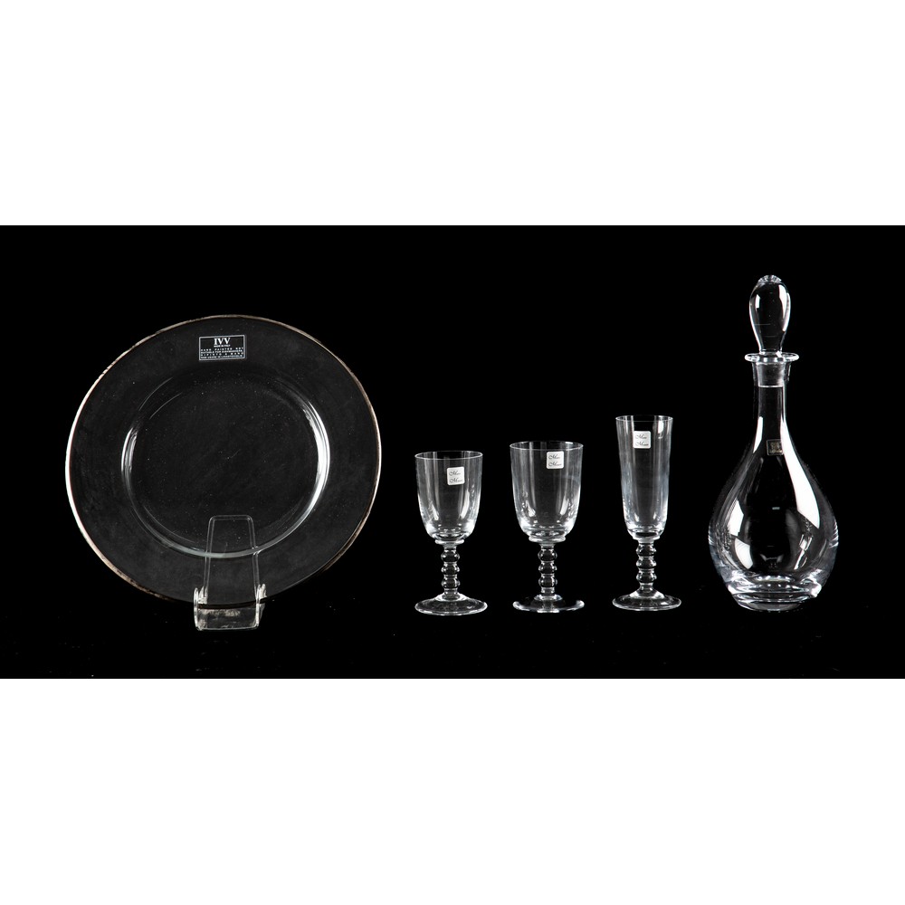 IVV 6 sottopiatti in vetro trasparente con bordo argentato. Servizio di bicchieri con stelo in cristallo trasparente modello “Ego” composto da 37 pezzi così suddivisi: 12 calici da acqua,12 calici vino,12 flûte e una bottiglia con tappo.