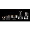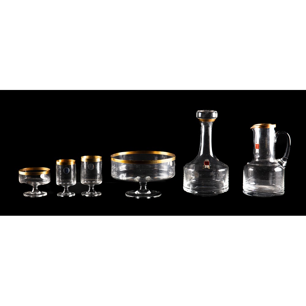 Una raccolta di 119 bicchieri in cristallo trasparente con bordo oro così suddivisa: 6 bottiglie, 6 caraffe, 41 coppe da macedonia, cinque alzate,25 bicchieri acqua, 36 bicchieri vino.