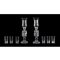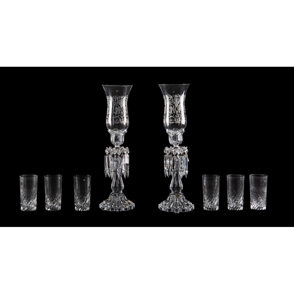 Val Saint Lambert 6 bicchieri in cristallo trasparente intagliato da whisky modello “Gob Zarra”. Coppia di flambeaux monocera in cristallo trasparente modello “Bambou” con diffusori decorati a motivi incisi.