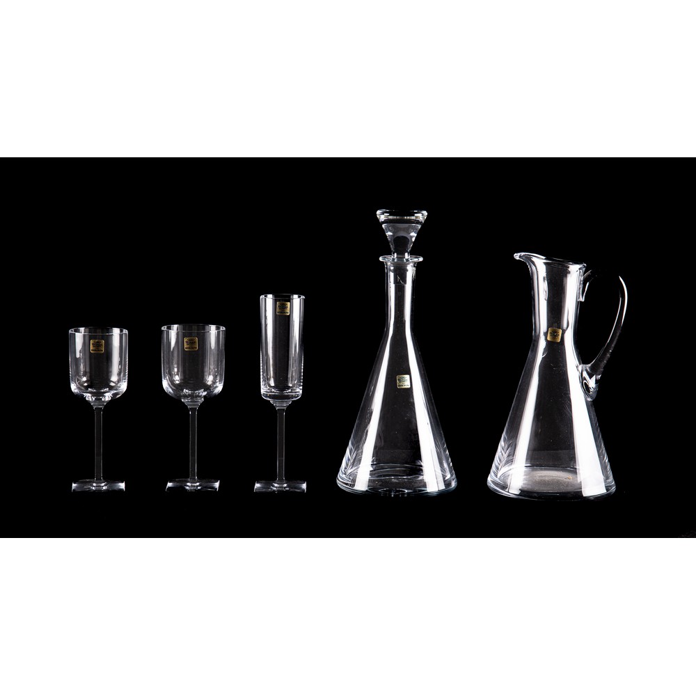 Servizio bicchieri con stelo modello “Diagono” in cristallo trasparente composto da 38 pezzi così suddivisi: 12 bicchieri acqua, 12 bicchieri vino, 12 flute, una caraffa, una bottiglia con tappo.