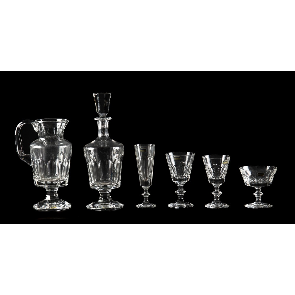 Servizio di bicchieri in cristallo taglio a coste composto da 46 pezzi così suddiviso: i 12 bicchieri d’acqua, 6 bicchieri vino, 12 flûte, 14 coppe da champagne, una bottiglia, una caraffa.
