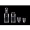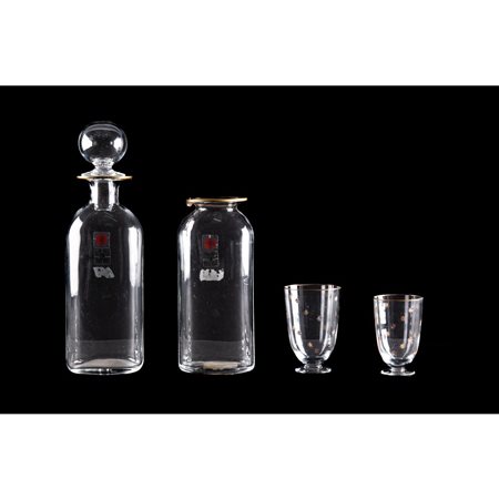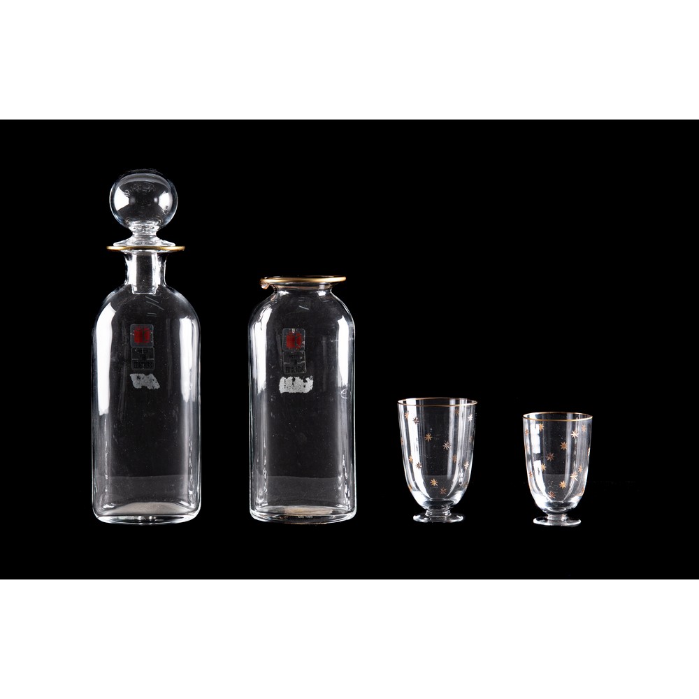 Servizio di bicchieri in vetro soffiato e decorato con motivi a stella in oro, composto da 29 pezzi così suddivisi: 12 bicchieri acqua,12 bicchieri vino, una bottiglia e una caraffa bordate in oro.