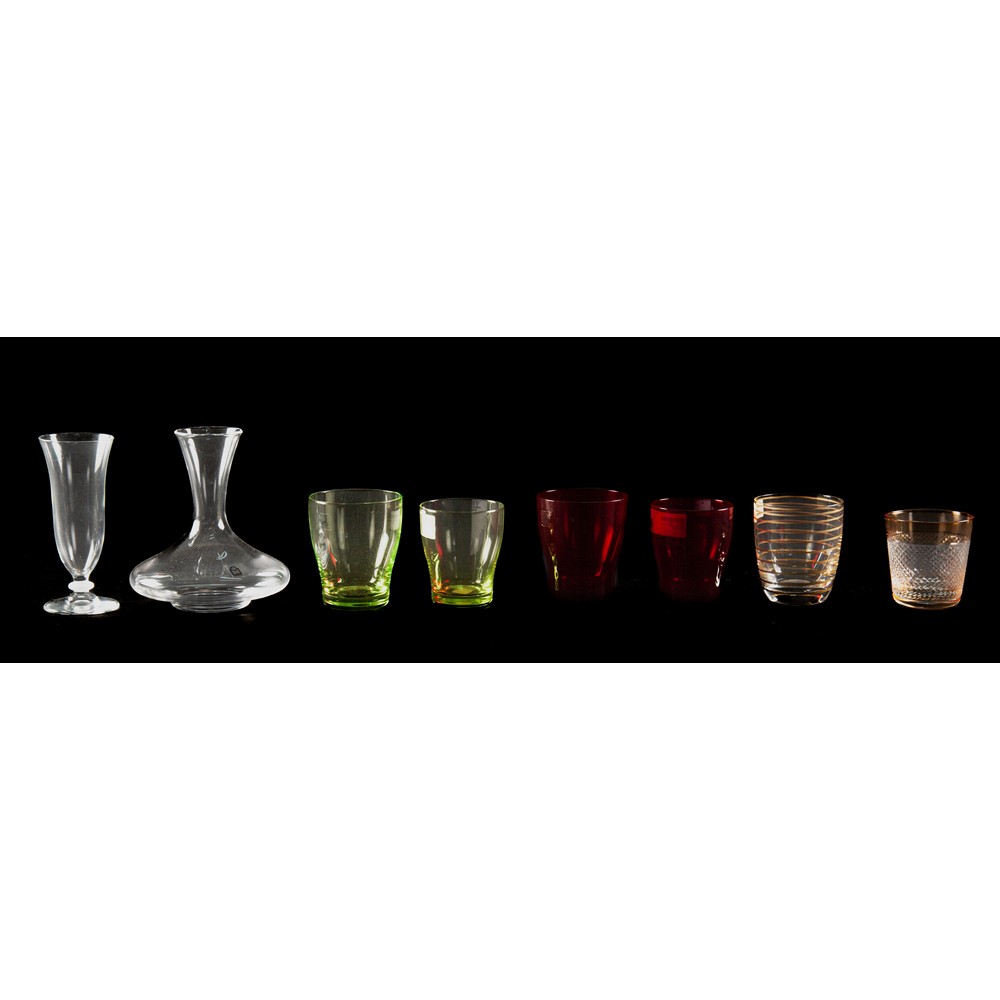 Una raccolta di 66 bicchieri in vetro colorato e trasparente ed un decanter così suddivisa: 12 bicchieri acqua in vetro verde, 6 bicchieri vino in vetro verde, 12 bicchieri acqua in vetro magenta, 12 bicchieri vino in vetro magenta, 6 bicchieri vino modello “Griffe” in vetro salmone, 6 bicchieri vino Galbiati in vetro trasparente e oro, 12 flûte Laveno modello “Lotus”, un decanter piccolo in cristallo trasparente.
