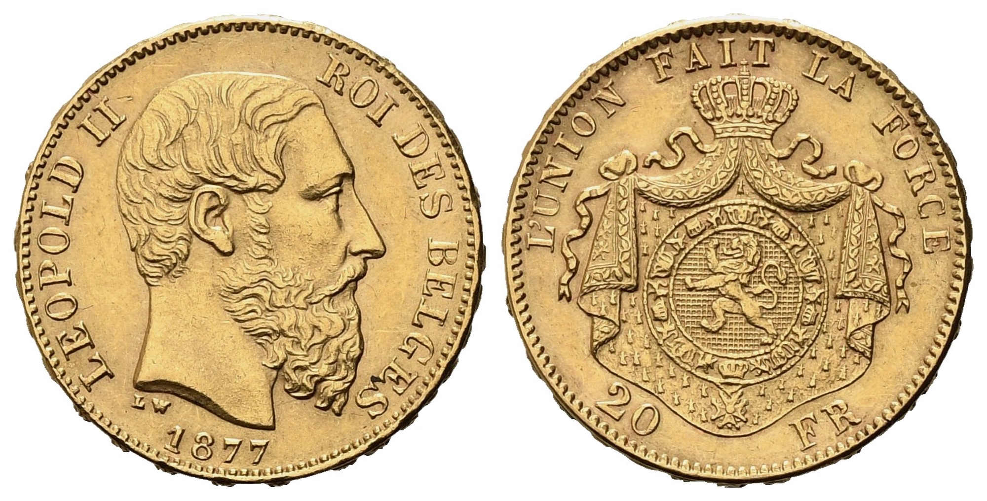 BELGIO. Leopoldo II (1865-1909). 20 franchi 1877. Au (21,30 mm – 6,48 g). SPL/FDC